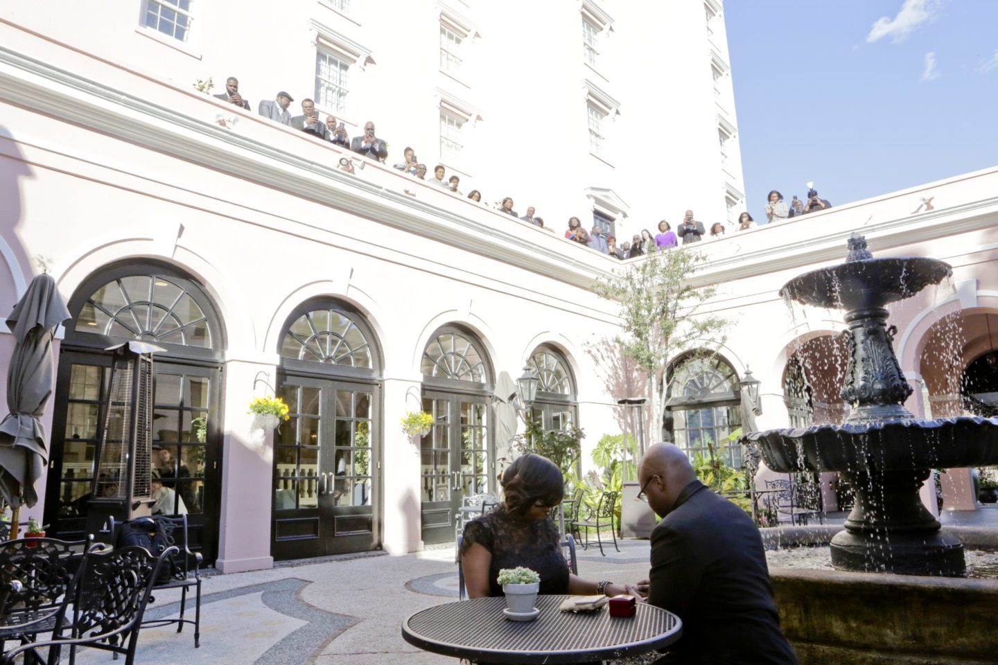 WOW!!! It was all a surprise! He told me two weeks prior that the he was receiving a community award from the City of Charleston. He is a Police Officer for the City of Charleston. I was so extremely proud and excited about him receiving this award. He said it was a black tie event. So thata��s where I thought I was going. We stopped at the Mills House to a�?kill some timea�? and have a drink. He said that he had to give a speech after he gets the award. So as we are sitting in the beautiful court yard he goes a�?Ia��m going to practice my speech so you can hear it. He stood up and begin to tell me how much he loved me and asked me to marry him. But the shocker was after he gave me the ring, he gave me another gift. I opened the box and it was a beautiful cake cutting set. So I asked what this about. Hea��s so unique, He does things his way and always thinks outside of the box so Ia��m thinking a�?Oh God, what is he up to now. So he said this is to cut our wedding cake. Ia��m still puzzled. Then he says a�?If you want to, everything is set up for us to get married today!!! My first response wasa��youa��re jokinga��quit playing. And he goes, Ia��m serious, turn around and look up. And I did!!! All of our family and friends were on the rooftop screaming and looking at us the entire time. I was like the scene from a movie. I cana��t even put into words how magical the moment was.