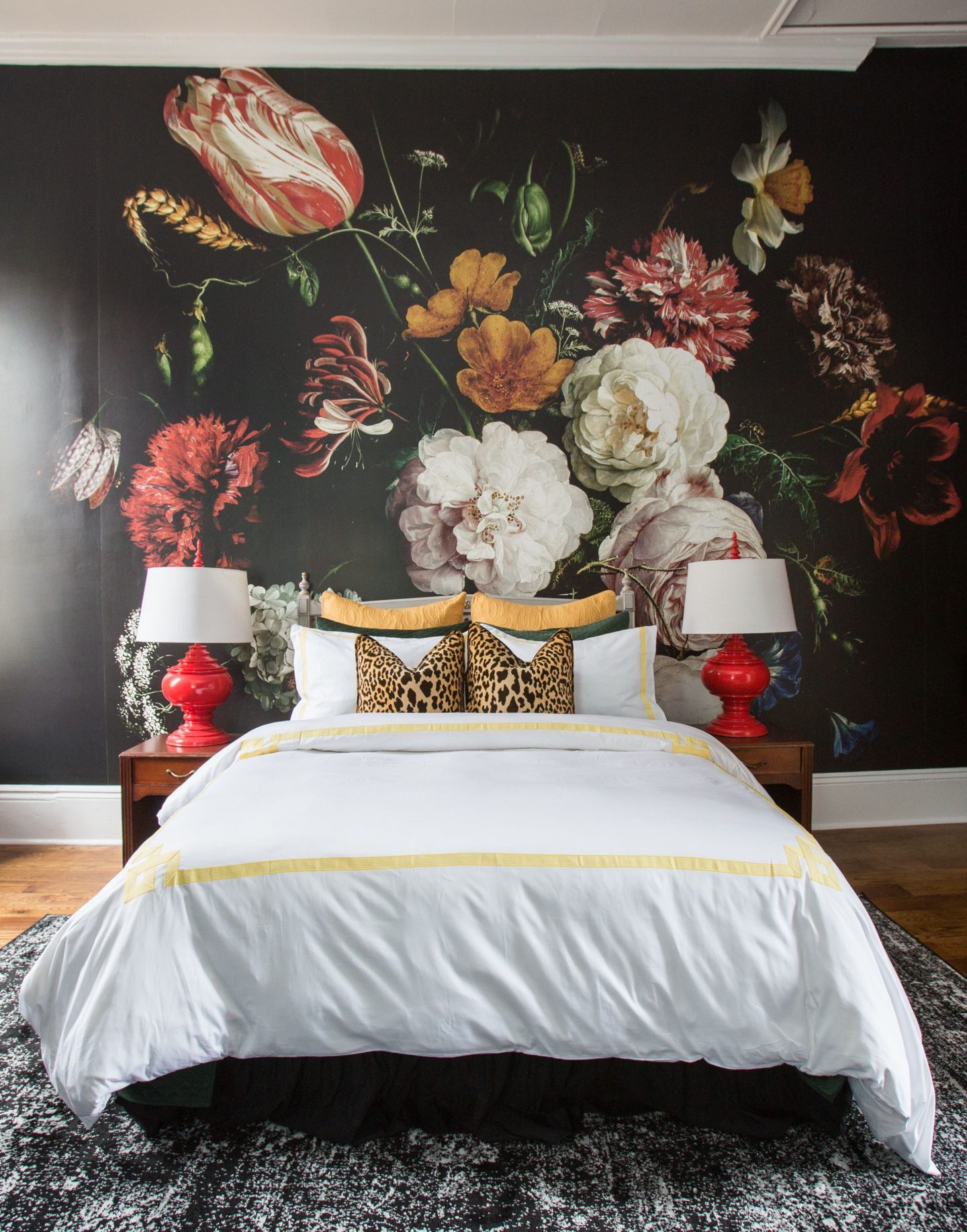 Wallpaper is definitely back in style and we adore this moody floral wallpaper especially anchored by the traditional bed linens and bold red lamps.