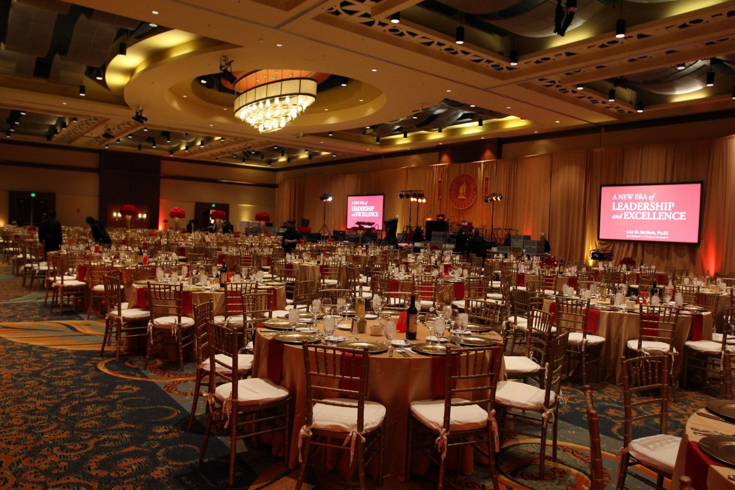 Gold chiavari chairs with white padded seats were a classic choice for this HBCU gala.