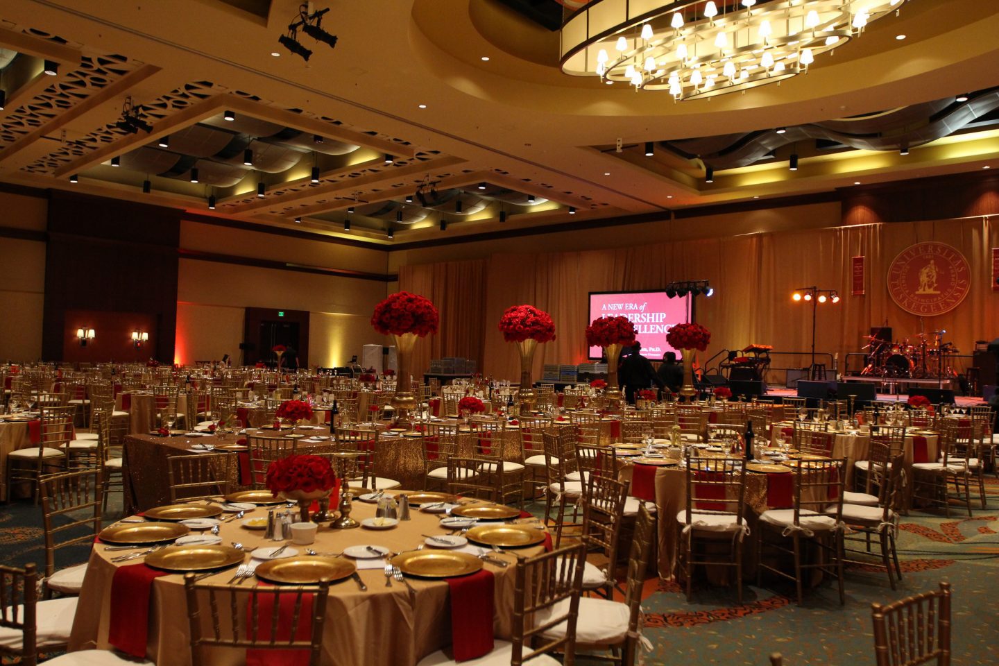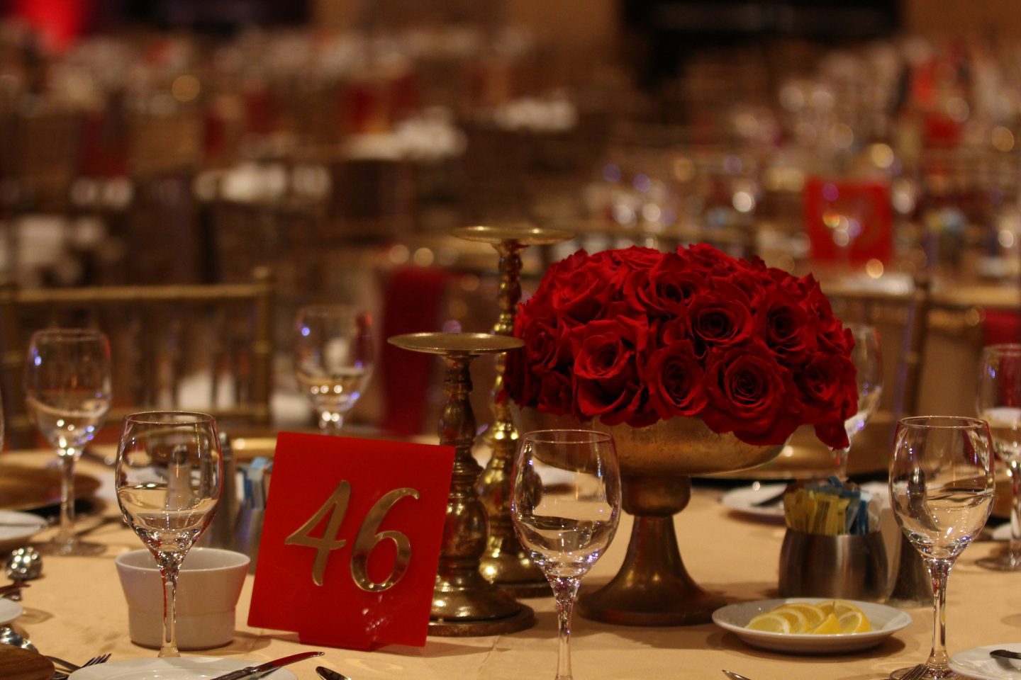 Nothing says southern like an estate table in the middle of the gala. We adore the red roses and traditional gold vessels holding the flowers to match the Tuskegee University colors.
