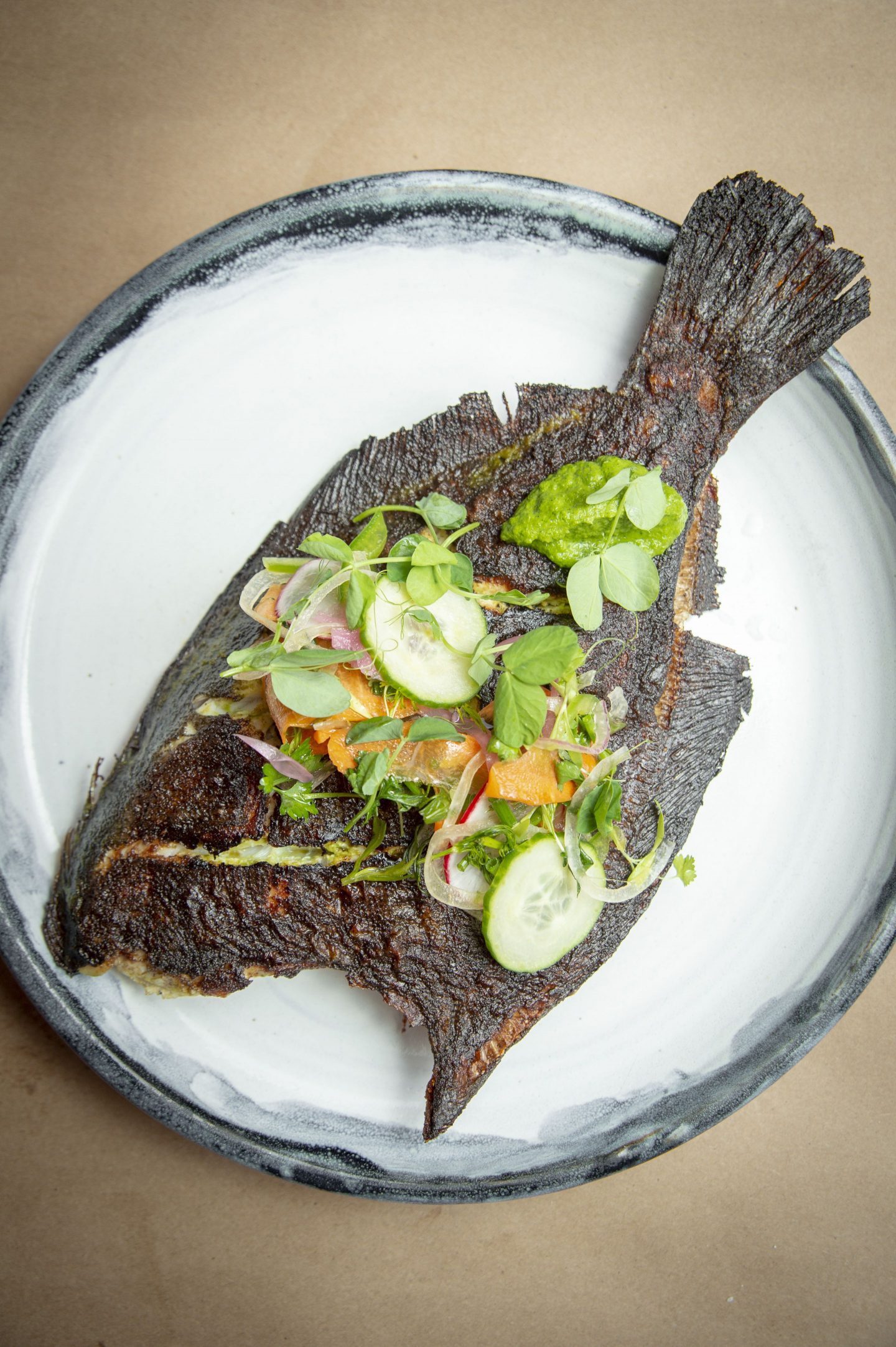 Or, try the Seared Redfish Pasta (with baby carrots, spring onions, kale, asparagus, English peas, tomato conserva and rocket pesto), the Mahi Mahi (with escovitch vegetagles, Anson Mill’s faro verde and spicy red curry coconut sauce) or a herb-roasted whole fish of the day (with grits, shaved vegetables and salsa verde).