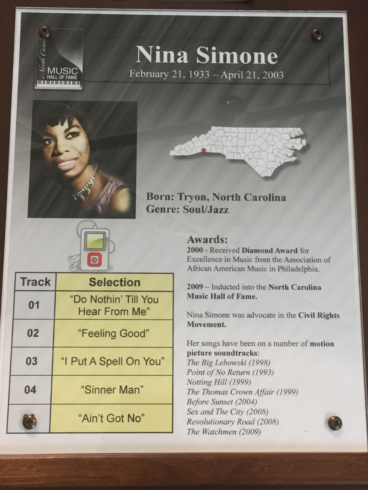 There is a statue of Nina Simone at the Nina Simone Plaza In Tryon, North Carolina.