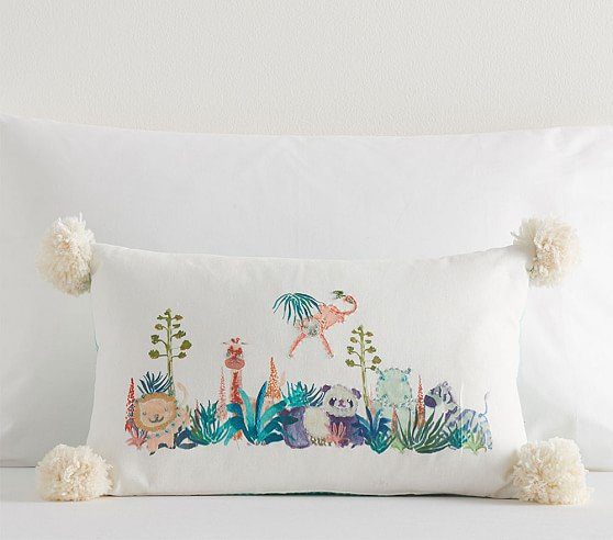 Justina Blakeney Jungalino Embroidered Animal Lumbar Pillow: Welcome to the jungle! Boasting exotic animals and pom-pom details, this colorful pillow lets your little one relax on the wild side. From the wild mind behind JungalowA� comes a whimsical collection from designer, artist and author, Justina Blakeney. With bold colors and patterns, each piece brings Justinaa��s signature bohemian style to life.
