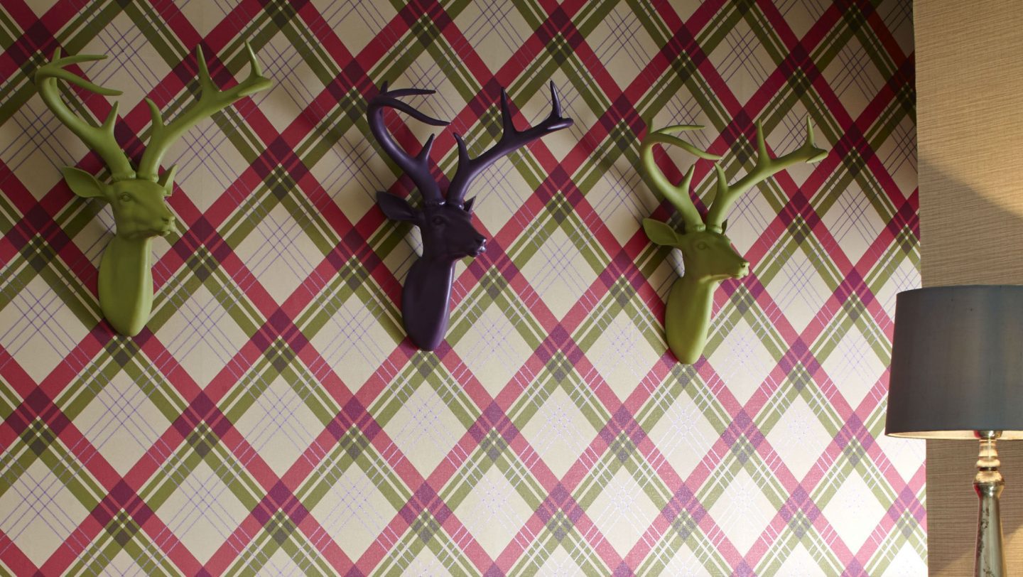 We adore this pink and green diamond shaped wallpaper paired with beautiful statement pieces.