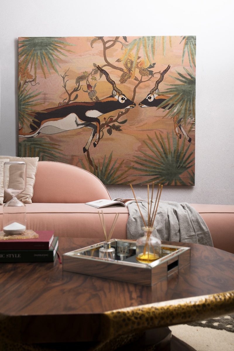 This room is a great mix of modern and bohemian with the coral colored sofa and wild life- inspired prints.