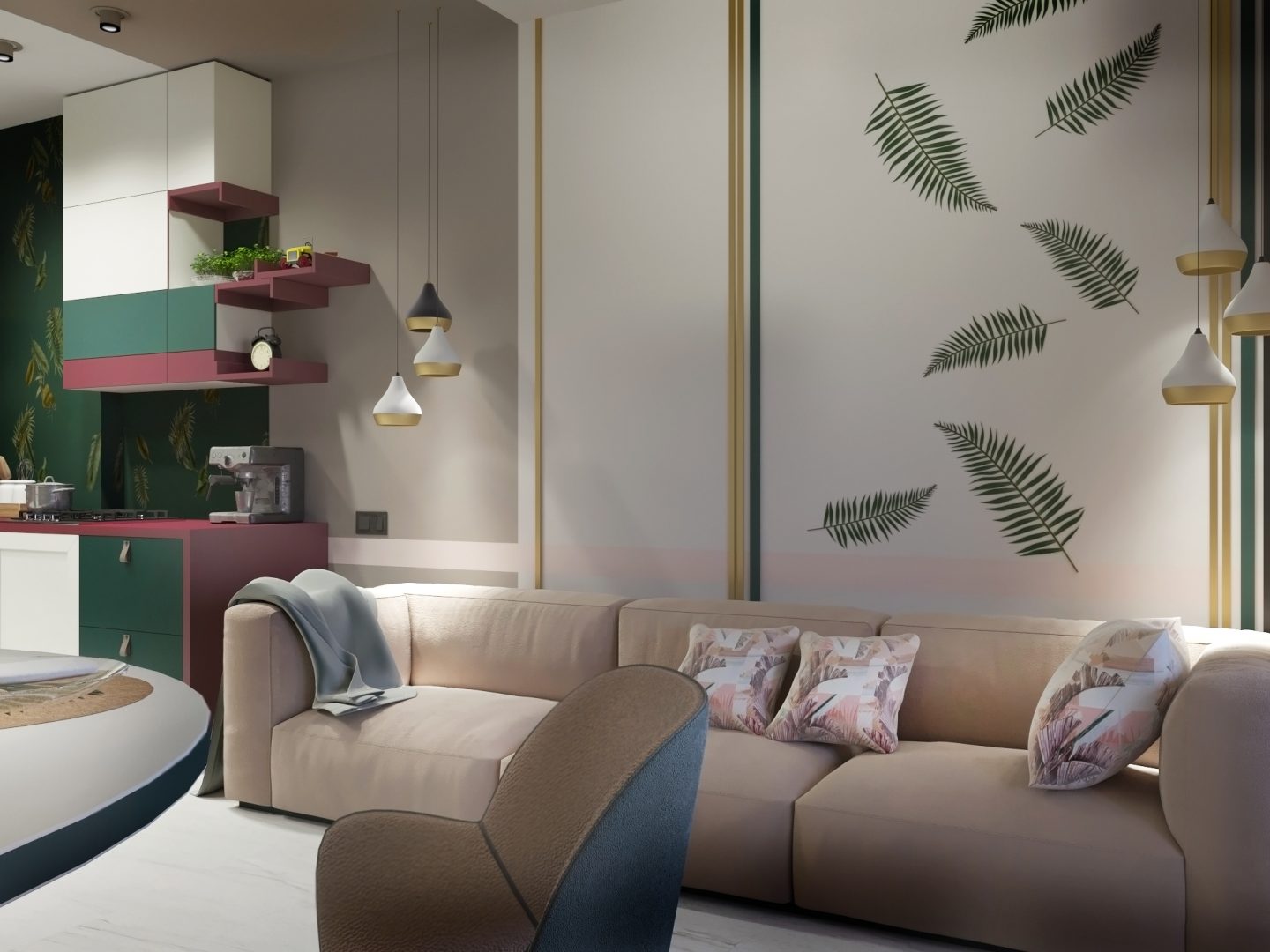 You can’t go wrong with a deep green velvet sofa with accents of palm trees on the wallpaper and hot pink ottoman.