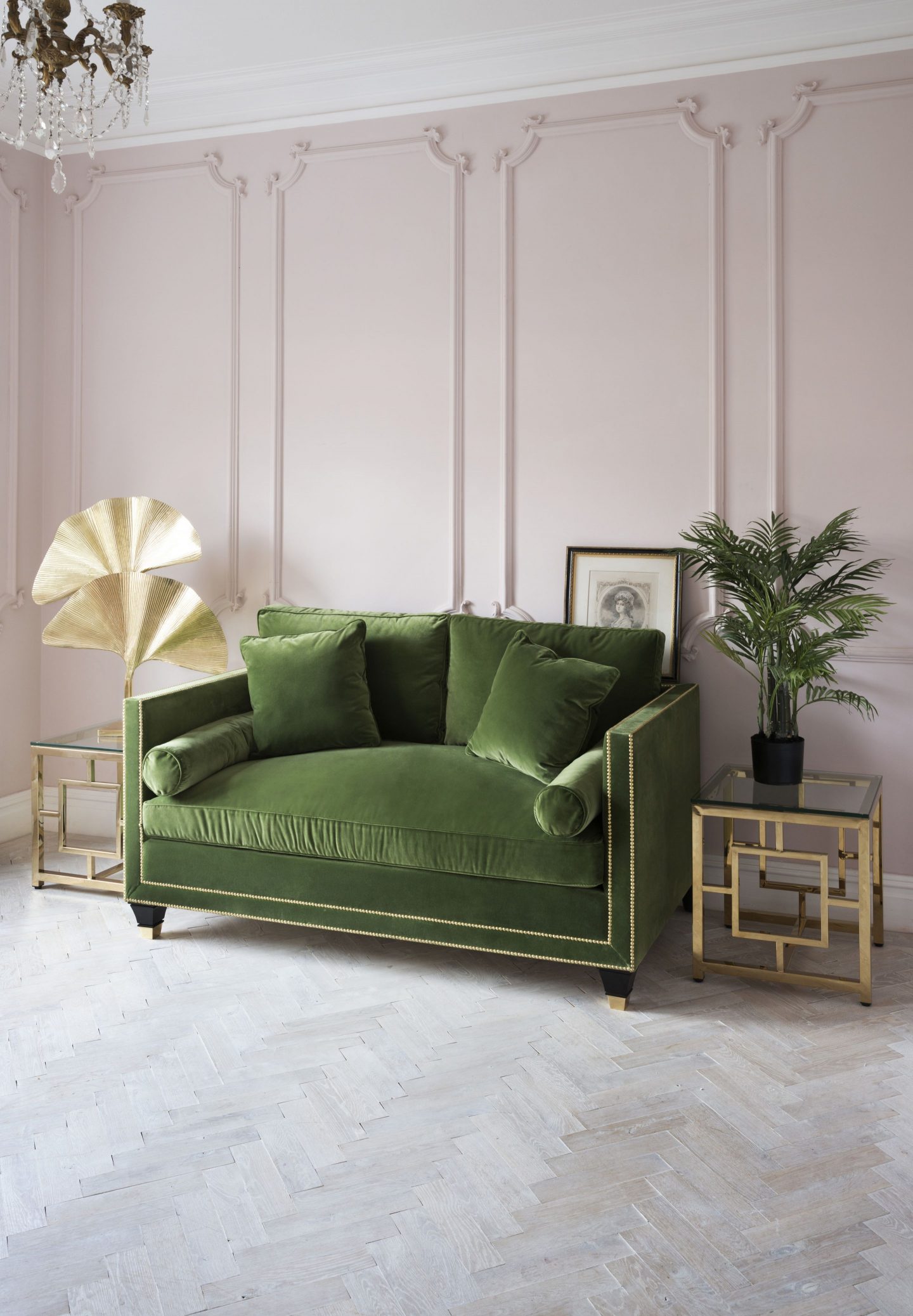 We adore this velvet, gold and pastel pink combination. Not to mention the whitewash herringbone floors!