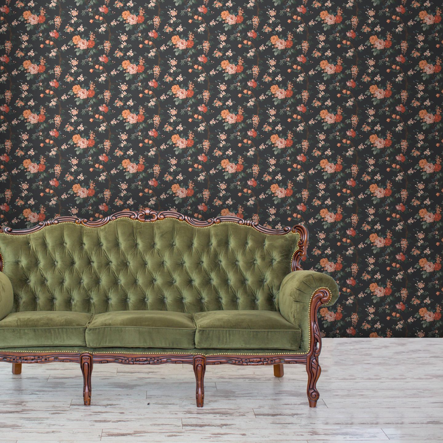 We adore this classic olive green tufted sofa with wood trim. The whitewash floors paired with dark floral wallpaper are perfect for an AKA who loves traditional yet bold decor.