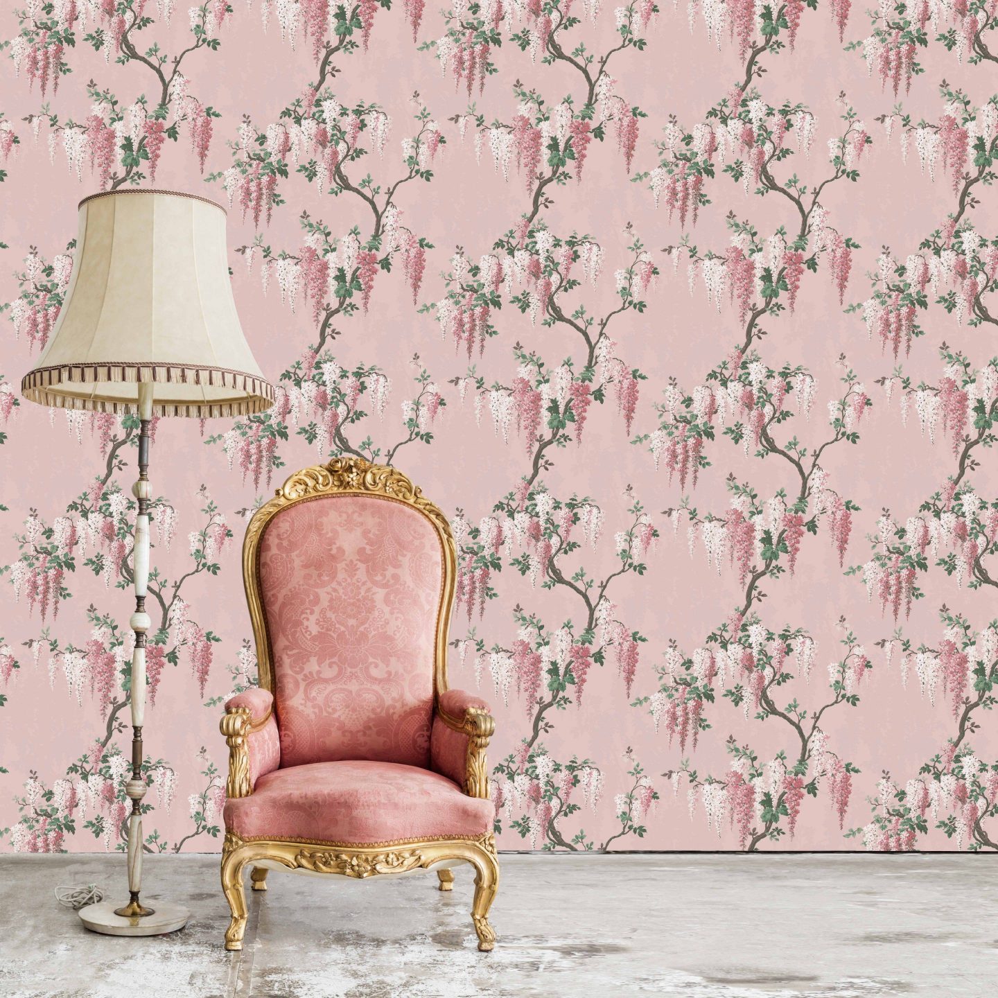 This room is the perfect inspiration for a reading nook or a ladies lounge. The soft floral wallpaper pairs perfectly with the antique pink throne style chair.