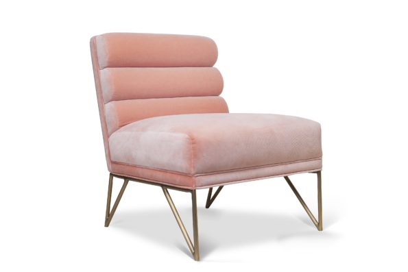 Influenced by midcentury design with a feminine twist, the Paulo Slipper Chair exudes luxury with its blush velvet upholstery and brushed brass hairpin legs. Art Deco elements integrated throughout the design juxtapose the sleek midcentury undertones.