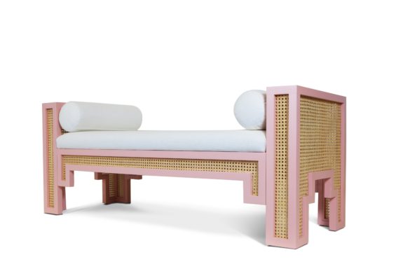 Channeling Old Hollywood Glam with a Cuban-inspired architectural silhouette, the Alexandra Bench features clean lines in a coral lacquered finish with cutouts that reveal a caned bodice. A pale blue seat cushion and matching bolster pillows complete the chic and feminine piece.