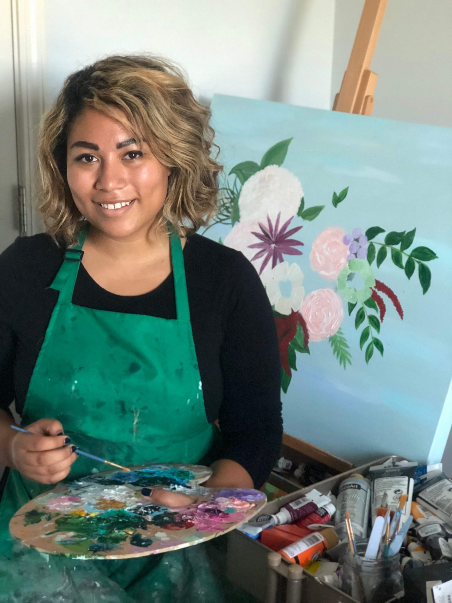 According to Addison “I come from a very creative and talented family, so as long as I can remember I have loved creating. I loved so many different arts, from playing cello to furniture making, but nothing spoke to me like painting. I taught myself to paint as a teenager and it helped me get through a hard time in my life. As I grew more into myself, my paintings evolved and my style continues to grow. I find my inspiration through nature, color and emotion. Painting allows me to capture a wide range of beauty, from the soft elegance of a botanical scene to the chaos of colors pouring together on a canvas.”