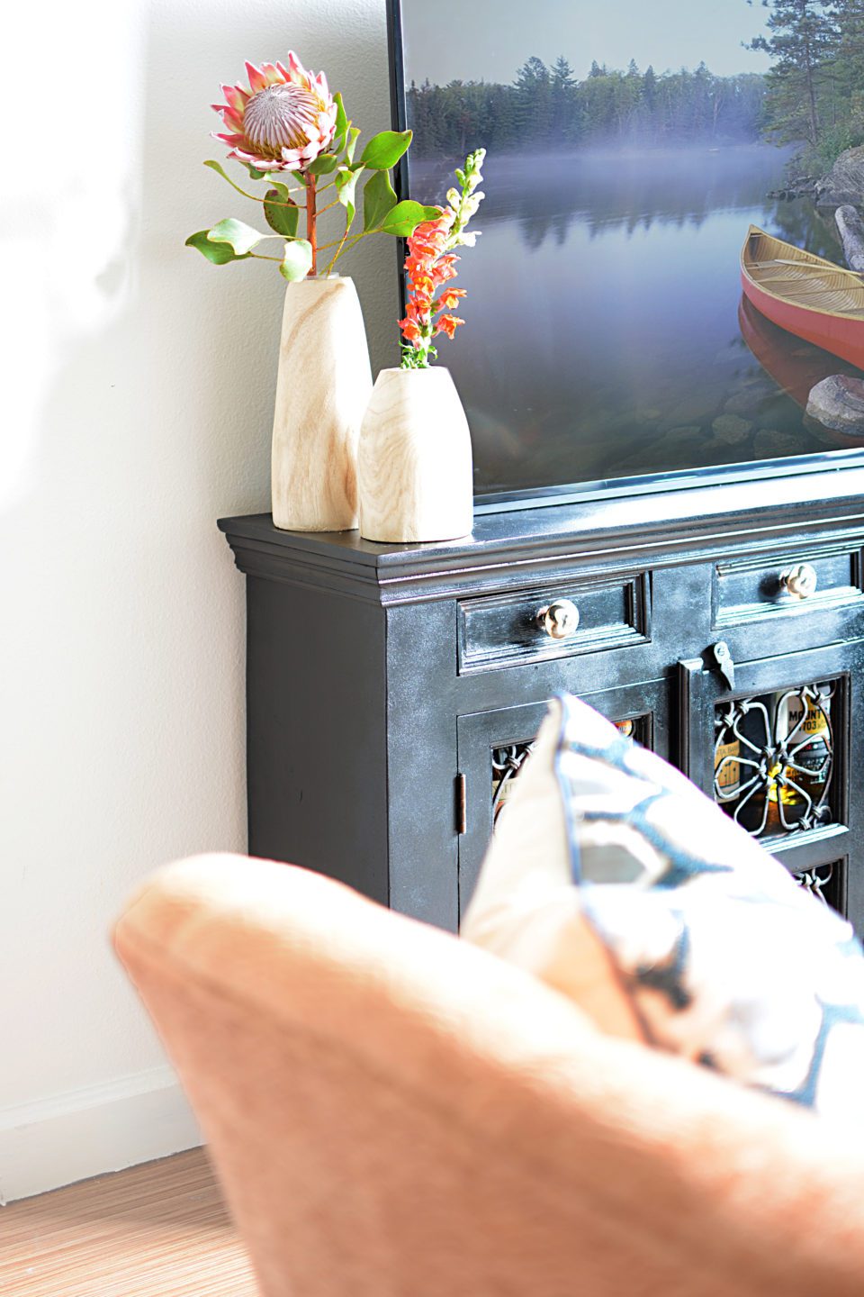 5)Through At Least One Transformer In The Mix: In any small space, youa��ll never have the square footage to fulfill all of your needs. In this project, our client, who loves to entertain, really wanted a bar area but we didna��t have the space to add a full bar to the mix. However, the credenza that her living room TV sits on was empty until we came up with the idea to paint it, add new hardware and convert it to a bar storage piece. Now, when shea��s entertaining guests she simply opens the credenza doors to pull out her wine glasses, bottle of wine and wine opener!