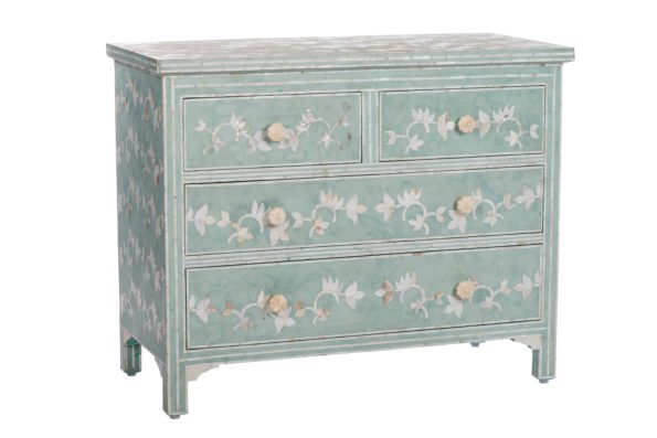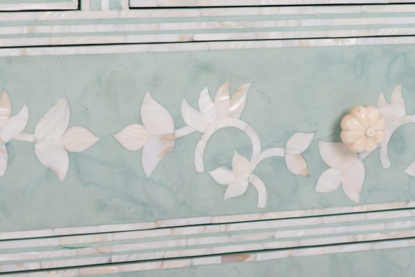 Mint Chest: Bone inlay and mother of pearl play a starring role in highlighting the Mint Chest’s beauty. Set against a mint hued backdrop, the bone and mother of pearl are hand inlaid in an abstract floral print throughout the sides with trim accents along the edges. 42” W x 20” D x 34” H