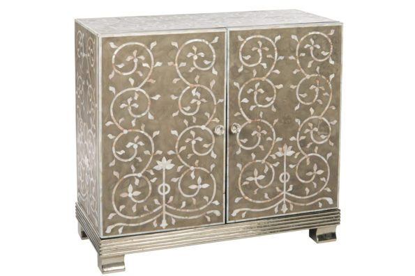Hand inlaid bone in a scrolling floral motif sets the Inlaid Cabinet above conventional styling. A brown taupe backdrop grounds the ornate look while nickel feet and hand carved rose petal wood handles add finishing touches. 35” W x 15.5” D x 32” H