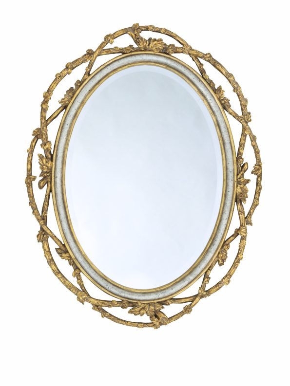 Mirror: The Mirror plays up its Old World charm with its antique gold finished frame. Designed with a faux bois relief, the frame also adds a few roses and petals for added charm. 29” W x 37” H