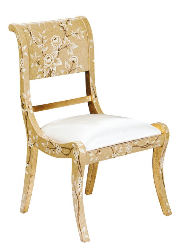 Klismos Chair: The classic Grecian-style occasional chair gets dressed up in hand painted floral details throughout the design. The Klismos Chair is finished in honey wood finish to better highlight the delicacy of the painted relief. 22.5” W x 24” W x 37.5” H