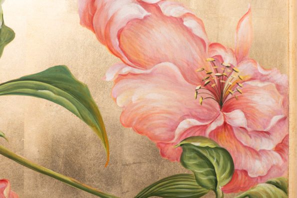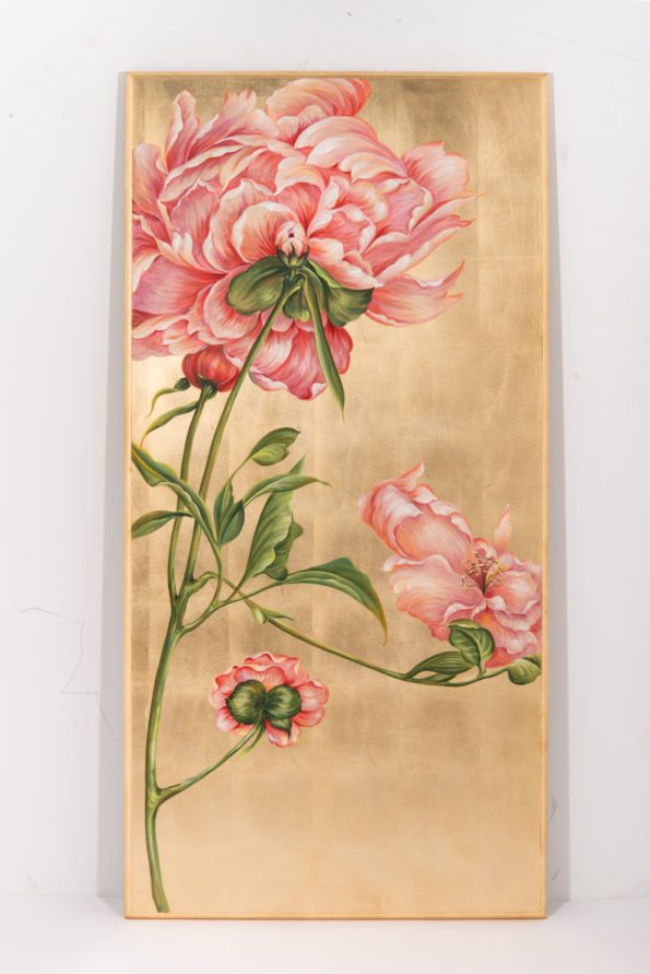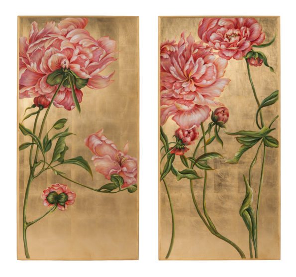 Wall Décor: Shown in a set of two in a diptych style, the Wall Décor depicts peonies in full bloom whose vivid pink hues harmonize with the gilded canvas background. Each panel is wrapped in a simple gold finished frame. 26” W x 52” H