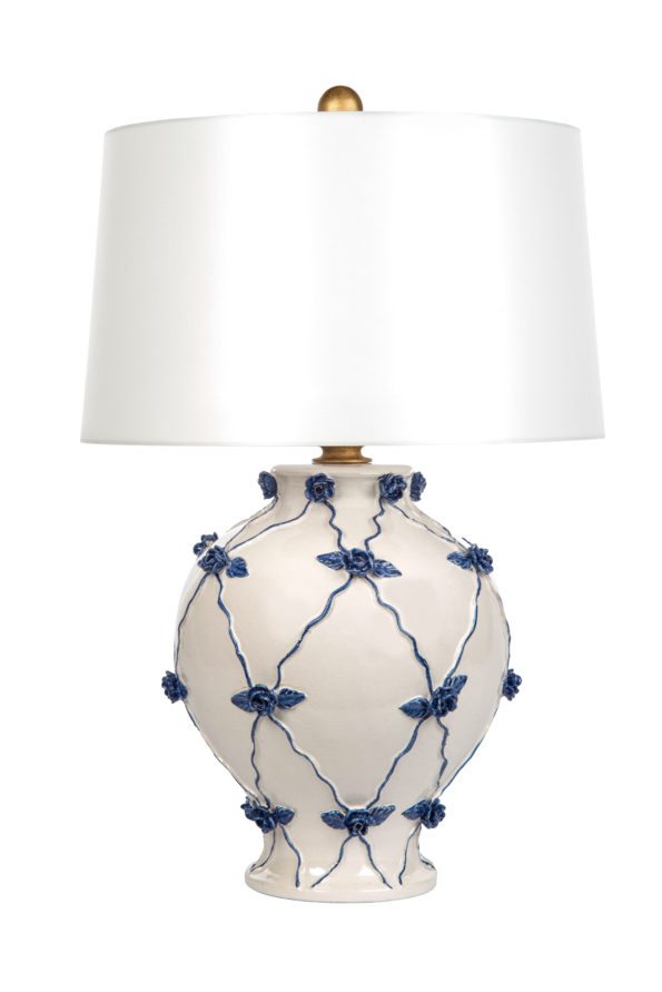 Trellis Bloom Lamp: A periwinkle rose-and-vine raised relief over a milk ceramic body creates a rich dimensionality to the Trellis Bloom Lamp. A crisp white drum linen shade and gold finial add the finishing touches to this delicate beauty. 27” H