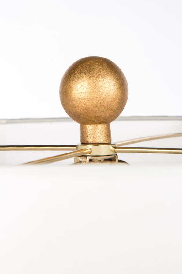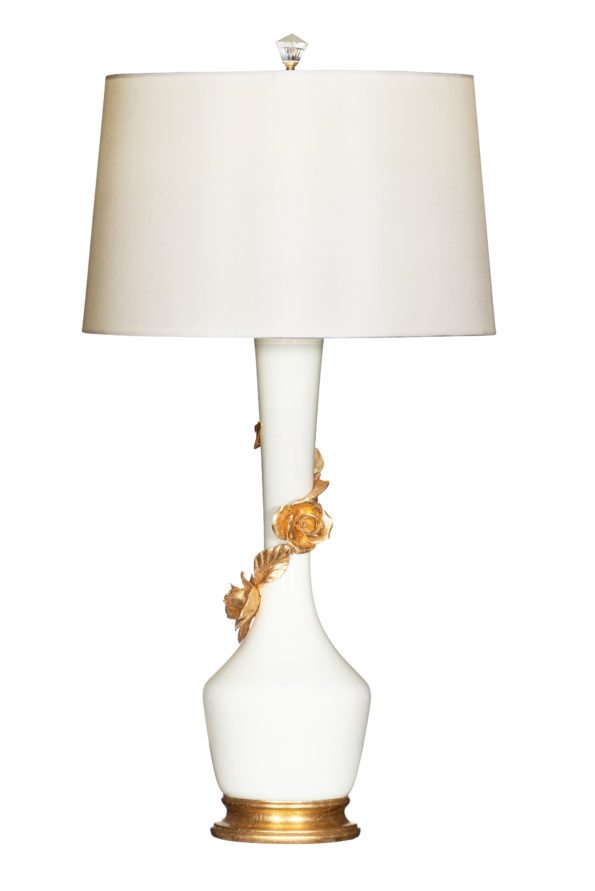 Avril Series: Cascading roses in gold leaf spiral around the Avril Rose Lamp, creating a luxe effect on the tulip-shaped base. Made from moisture-controlled clay in Nove, Italy, the Avril Lamp is offered in a mint or white finish and is finished with a white silk drum shade. 29” H