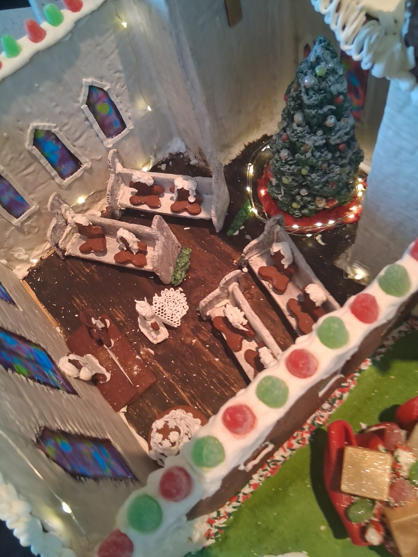 Masterfully crafted by baker Kelsie Mellot and the talented team at Hey Honey Cakery, the confectionary church captures the grace and grandeur of the historic Augusta landmark. From the detailed brickwork to the intricate stained glass windows, the attention to detail is breathtaking. Looking closer, viewers can peer inside to a touching scene: a festive Christmas wedding complete with sparkling lights, a grand Christmas tree, and a miniature wedding cake—a true celebration of life and community.