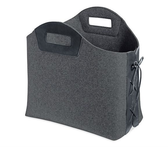 Store magazines and more in this sturdy felt tote. Leather laces and handles create a sophisticated mix of materials. The tote stands upright so you can easily place it next to your sofa or under your desk.