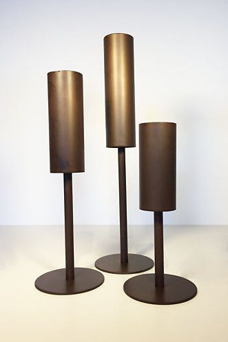 Whether displayed solo or in a group, these votive holders add an elegant, modern touch to your home. They are made of recycled steel and hand-welded in Minnesota. To create the distinctive patina, steel is dipped in a solution that reveals natural variations in color and texture, producing a weathered appearance. No two are exactly alike and the patina will change over the years from handling the candle holders.