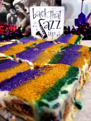 “We prepare Mardi Gras King Kake Bars. The King Kake Bars are a unique twist on the classic King Kake Bars. We offer these bars in our shop and always sell out,” said Chef Caress.
