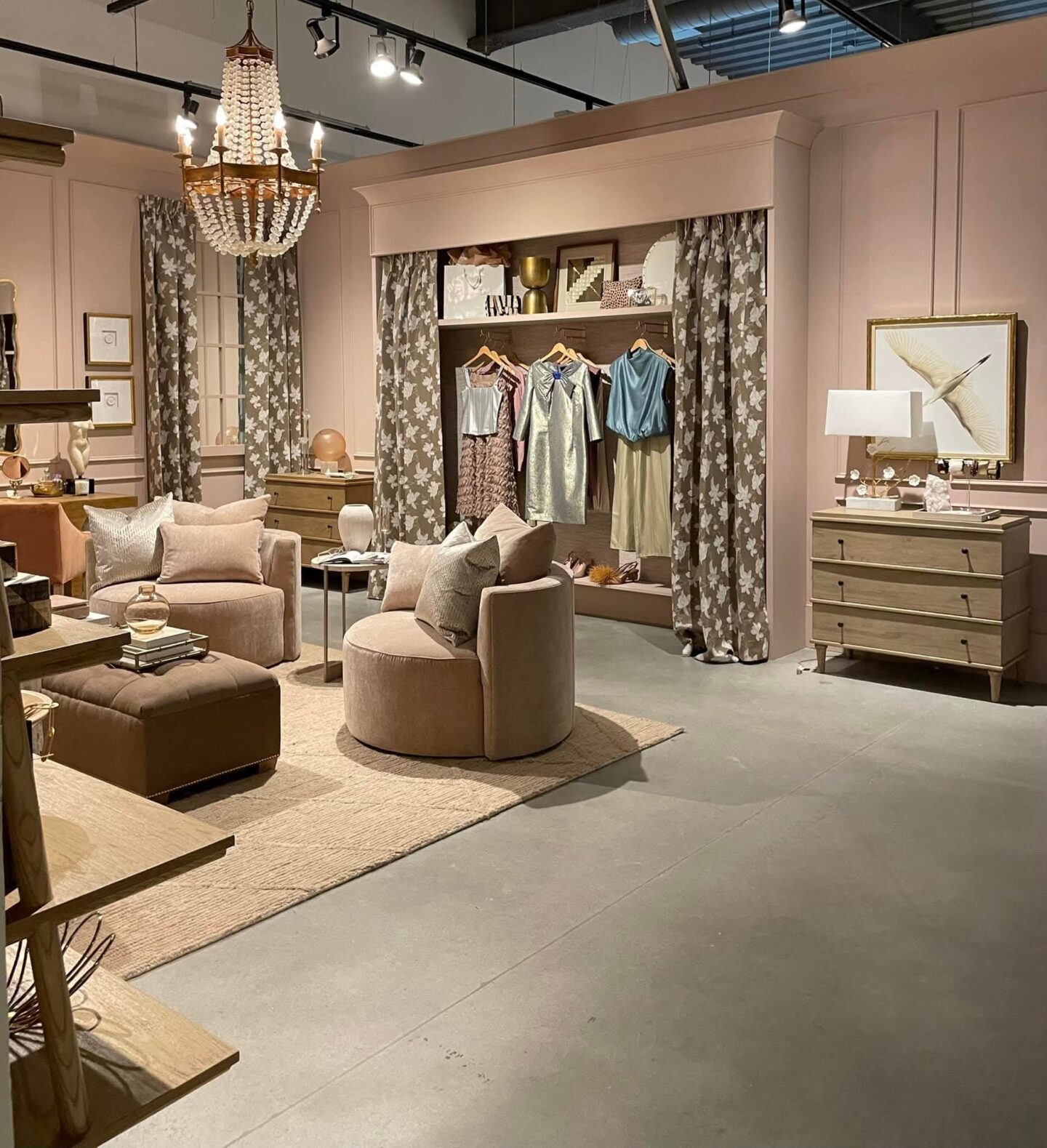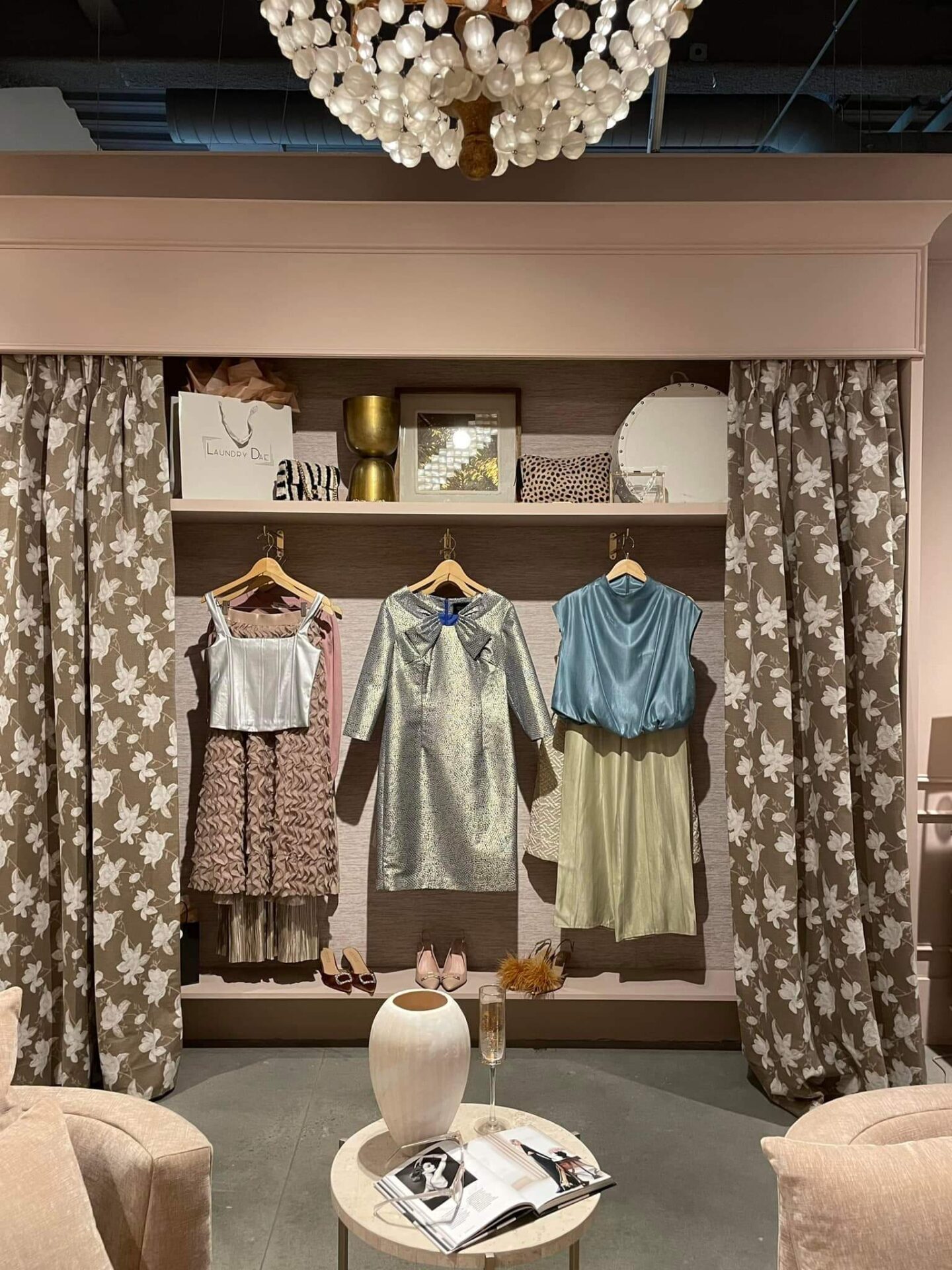 - Floral Accents: A unique floral textile anchors the space as the door and separation of fashion and home