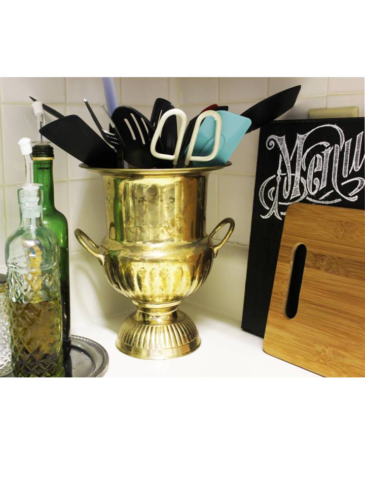 I love to use decorative items in the kitchen and one of my favorite pieces is a vintage brass champagne bucket that I use to hold spoons and utensils.  The bucket is functional, has lots of charm and the brass is beautiful against the white counters and tile.