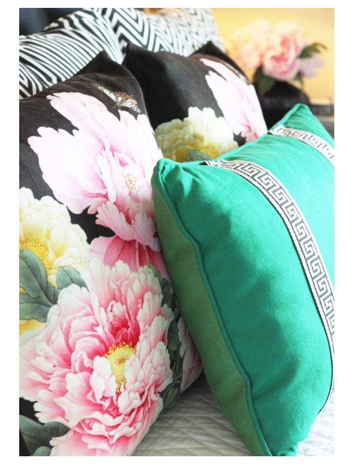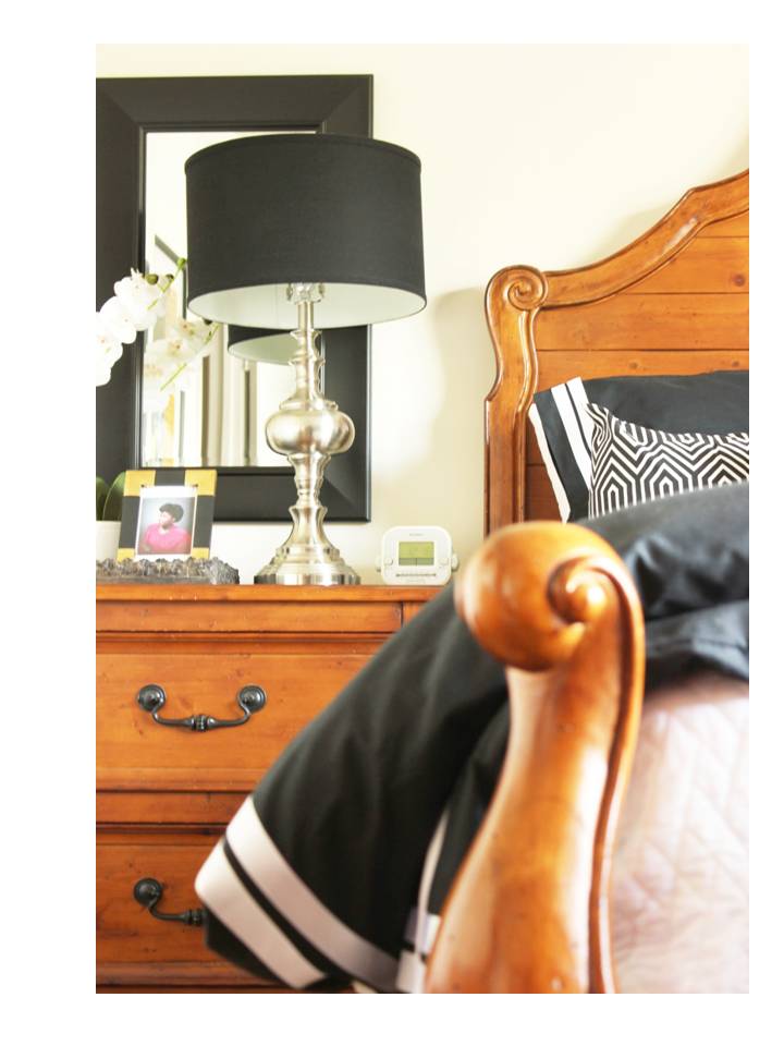 Our bedroom is my favorite space.  It’s not a large room but I just love the colors and patterns I used to design the space. The combination of wood and black make it comfortable for my husband and the floral and pink add the feminine touches I love.  {p.s.  I freshen up the look of  my bedroom décor every season  by changing my pillows and accessories}