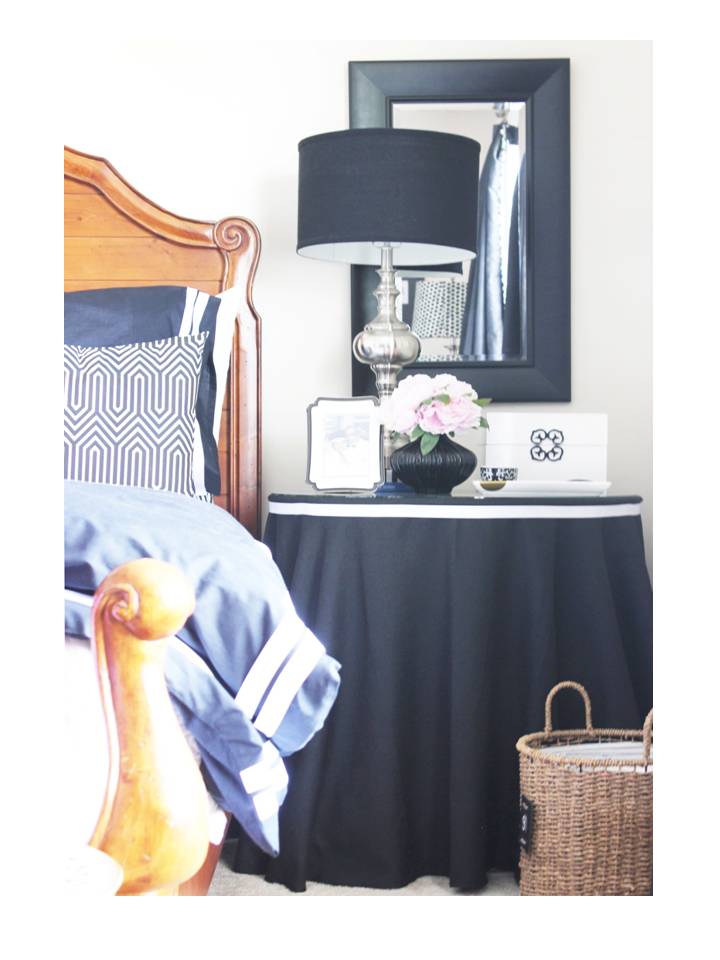 Two recent projects were creating the black and white bedding for our bed and giving a classic wood armoire new life by painting it, lining the drawers and updating the knobs.