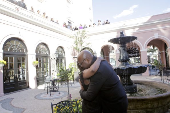 WOW!!! It was all a surprise! He told me two weeks prior that the he was receiving a community award from the City of Charleston. He is a Police Officer for the City of Charleston. I was so extremely proud and excited about him receiving this award. He said it was a black tie event. So thata��s where I thought I was going. We stopped at the Mills House to a�?kill some timea�? and have a drink. He said that he had to give a speech after he gets the award. So as we are sitting in the beautiful court yard he goes a�?Ia��m going to practice my speech so you can hear it. He stood up and begin to tell me how much he loved me and asked me to marry him. But the shocker was after he gave me the ring, he gave me another gift. I opened the box and it was a beautiful cake cutting set. So I asked what this about. Hea��s so unique, He does things his way and always thinks outside of the box so Ia��m thinking a�?Oh God, what is he up to now. So he said this is to cut our wedding cake. Ia��m still puzzled. Then he says a�?If you want to, everything is set up for us to get married today!!! My first response wasa��youa��re jokinga��quit playing. And he goes, Ia��m serious, turn around and look up. And I did!!! All of our family and friends were on the rooftop screaming and looking at us the entire time. I was like the scene from a movie. I cana��t even put into words how magical the moment was.