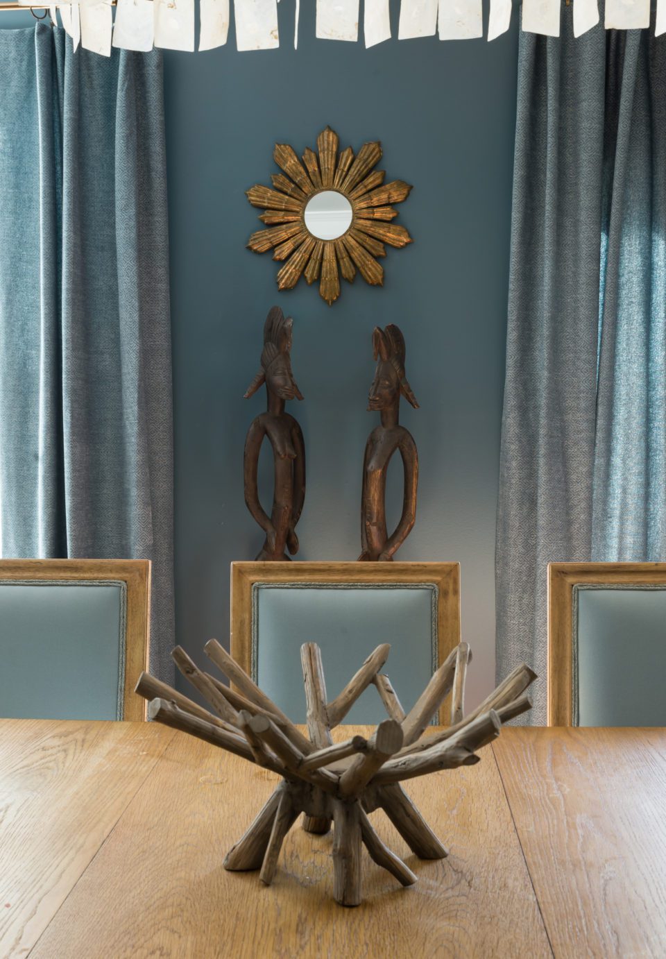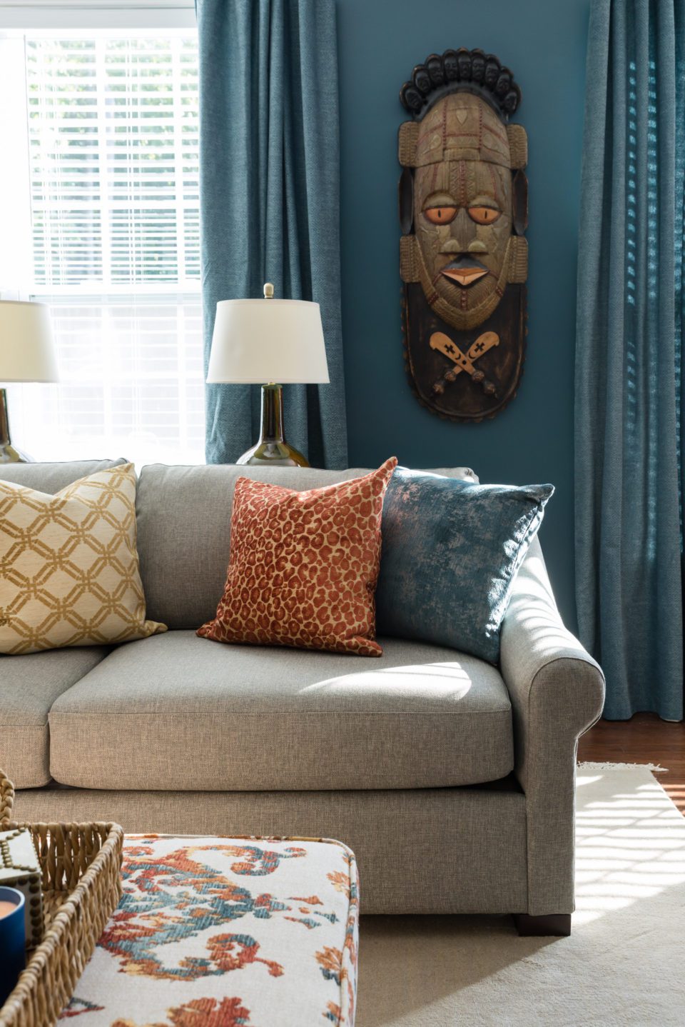 3)Don’t overdo it. Themeda spaces can get cheesy pretty quickly. Look for ways to subtly incorporate your theme. If you have a bold piece that you’d like to use, play it up by letting it take center stage. We did this with the very large African mask hung as wall art. Small art pieces, decorative accessories, books and artifacts can be sprinkled throughout the space but be sure to use some restraint. Remember, not every single addition to the space should play to the theme.