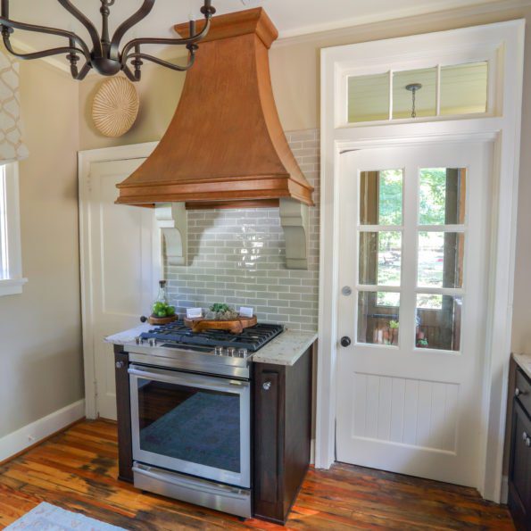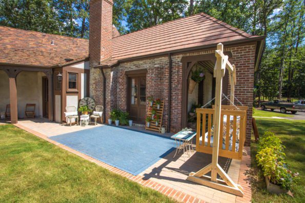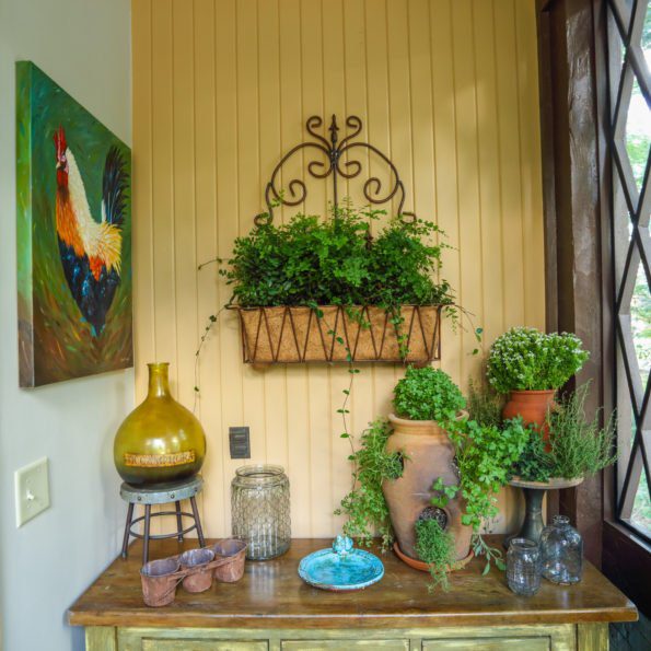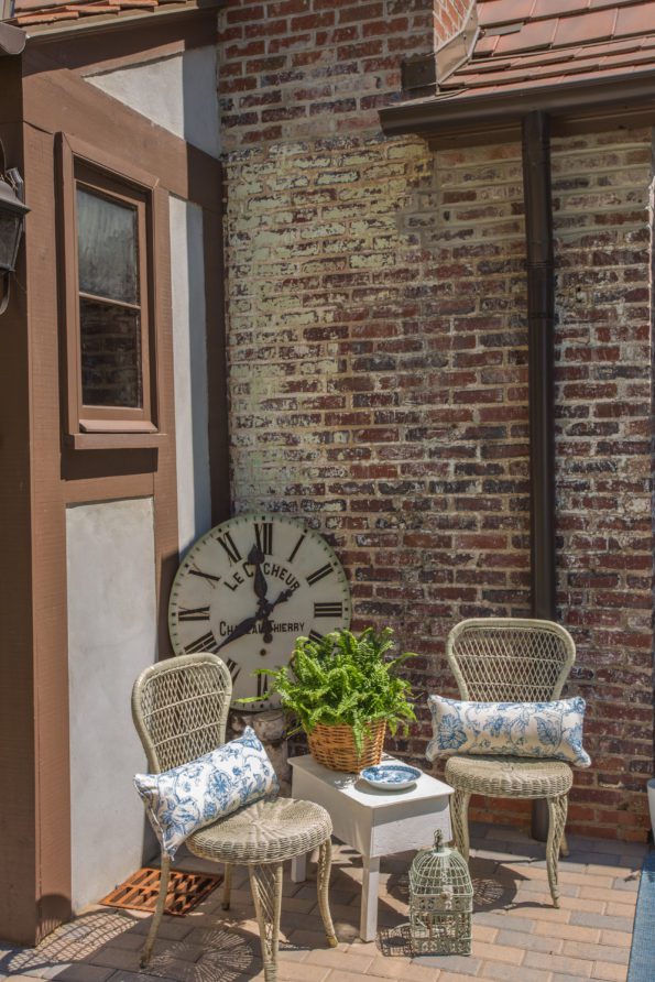 This is such a beautiful sunroom. We adore these neutral colors with pops of green accented by the exposed brick.