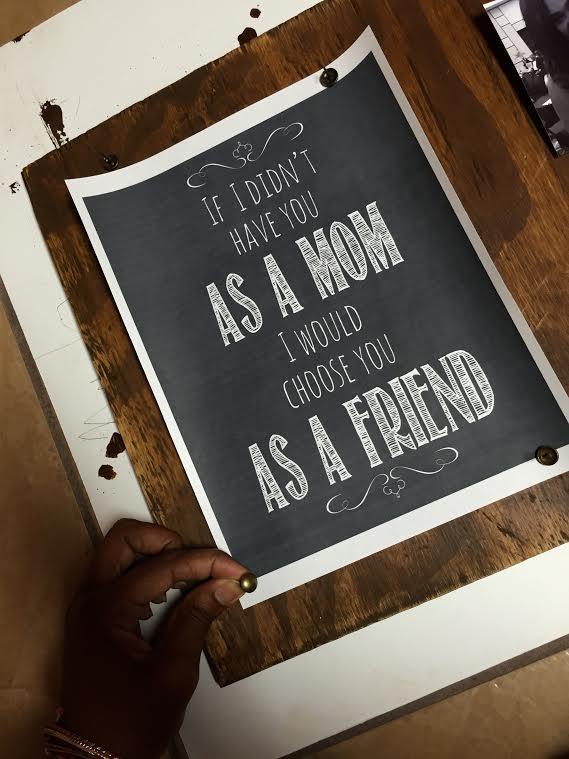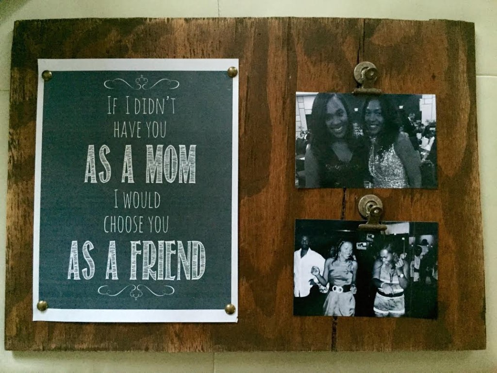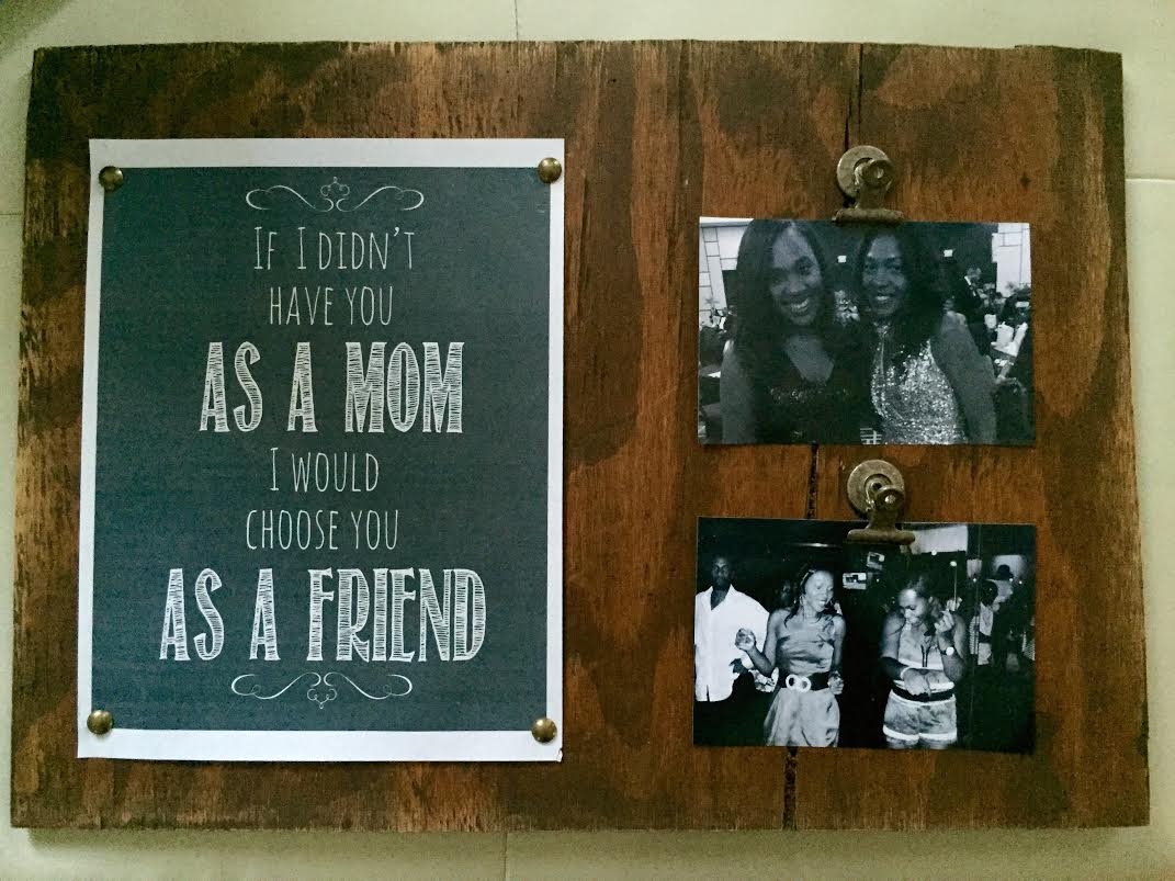 After you nail and glue the pics and print on, you’re done! Now the great thing about the site I used is that she has prints for your aunt, grandma, sister, and a few more so this can serve as a Birthday or “Just Because” gift. I hope I gave you enough detailed instructions and feel free to check out the original. Here’s another shot of the finished product and a shot of my beautiful Mom receiving her gift.