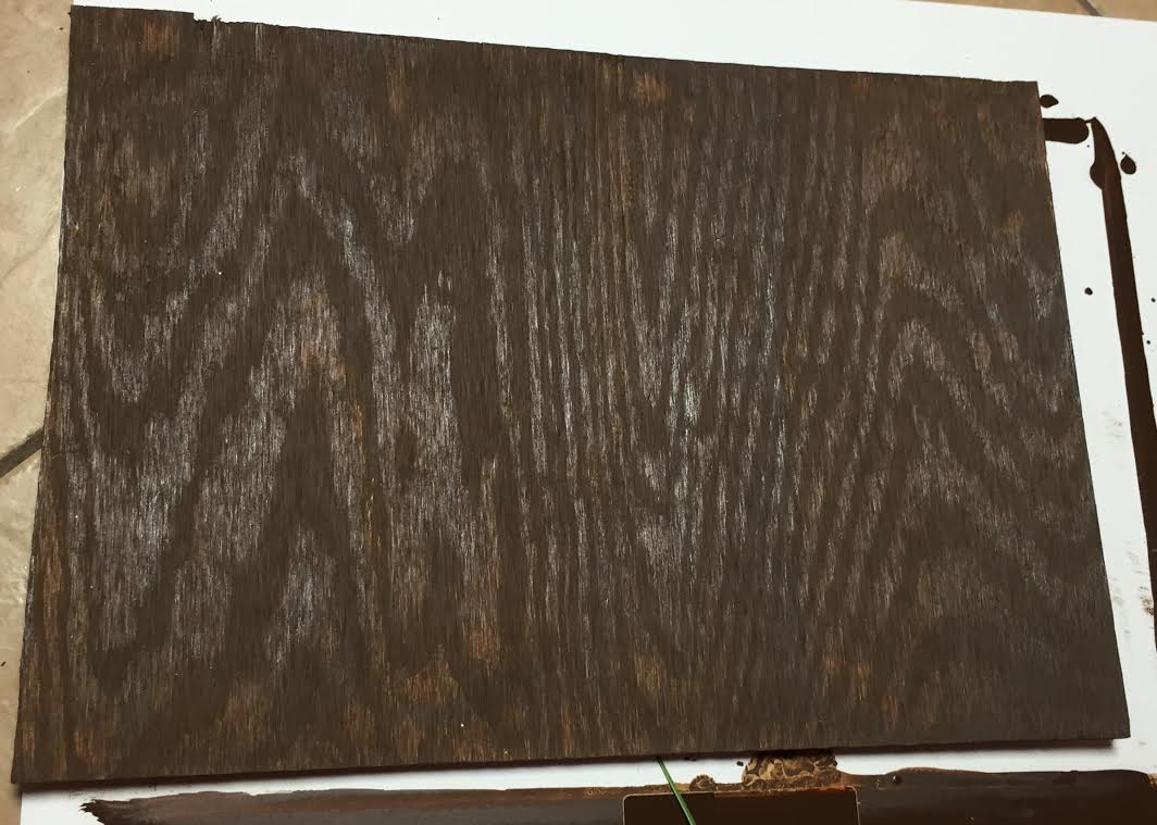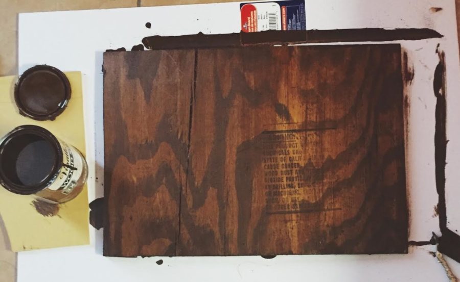 Okay! So the next part is VERY important. When you put your stain on, apply only ONE coat and then WIPE it down with a towel. I had to go through 2 boards before running for help and finally someone told me to wipe it down (It takes a village). When you first put on the coat, it will look like this when it dries.