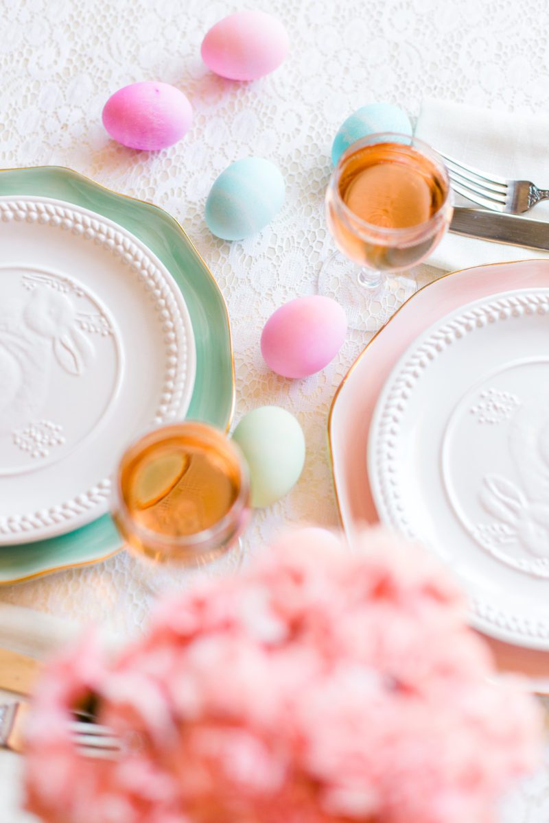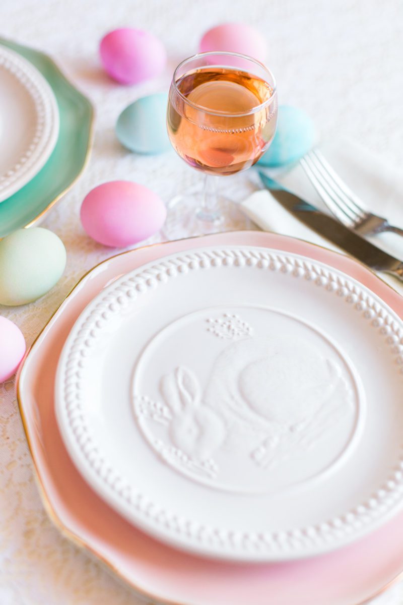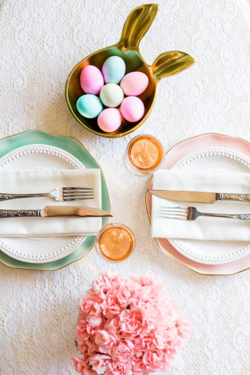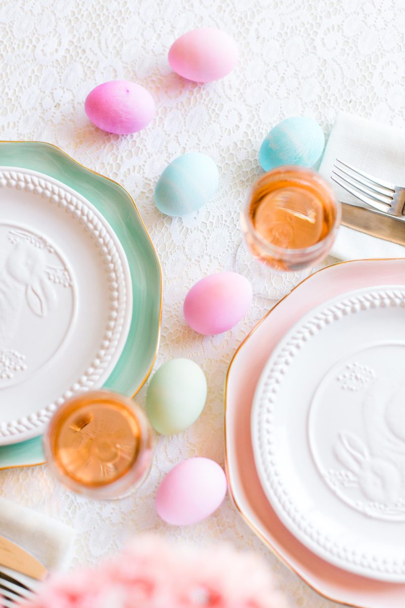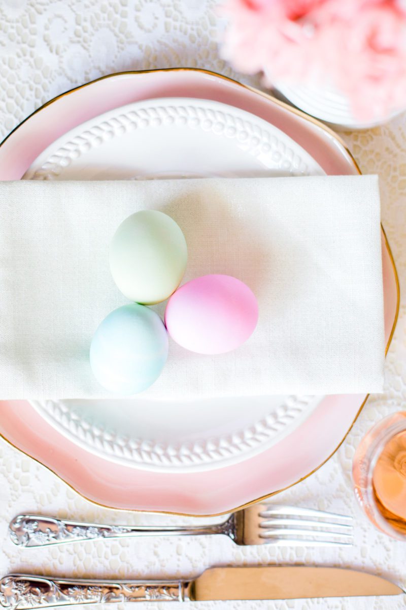 Less Is More: The combination of a beautiful pink charger, ceramic trimmed plate and pastel colored eggs is a the right amount of style for a simple Easter brunch.