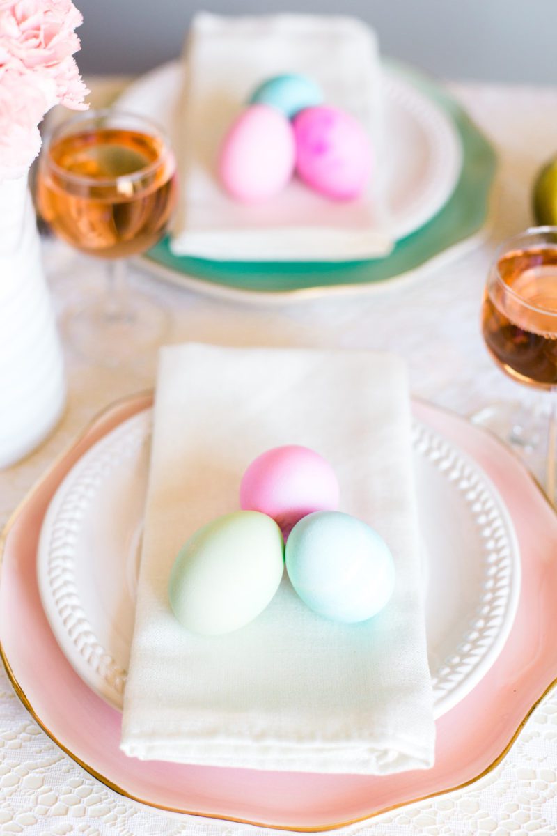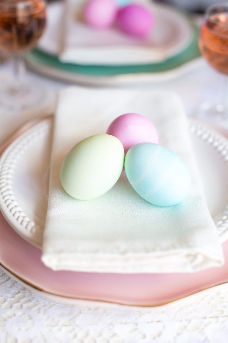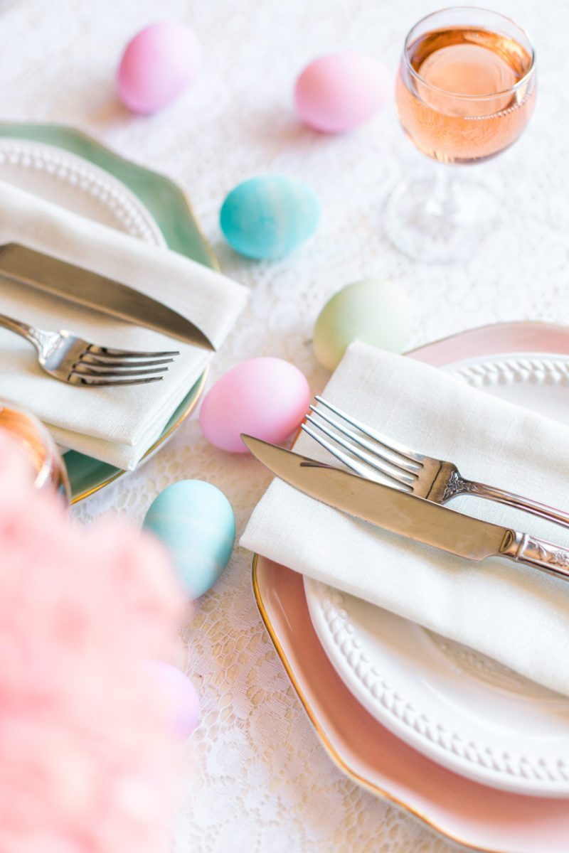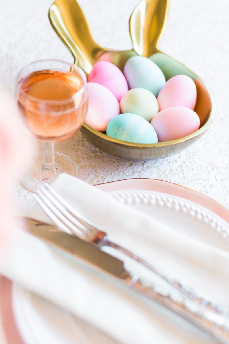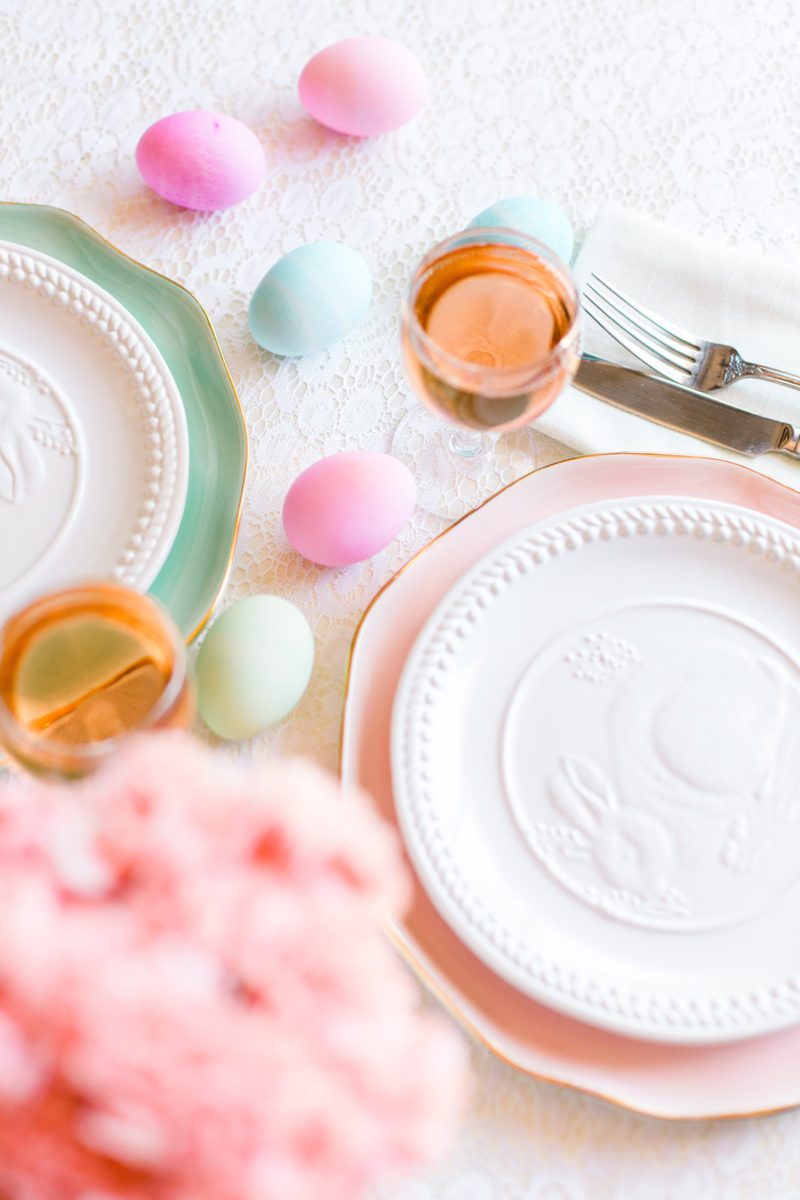 Less Is More: The combination of a beautiful pink charger, ceramic trimmed plate and pastel colored eggs is a the right amount of style for a simple Easter brunch.