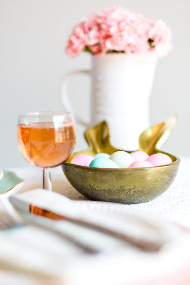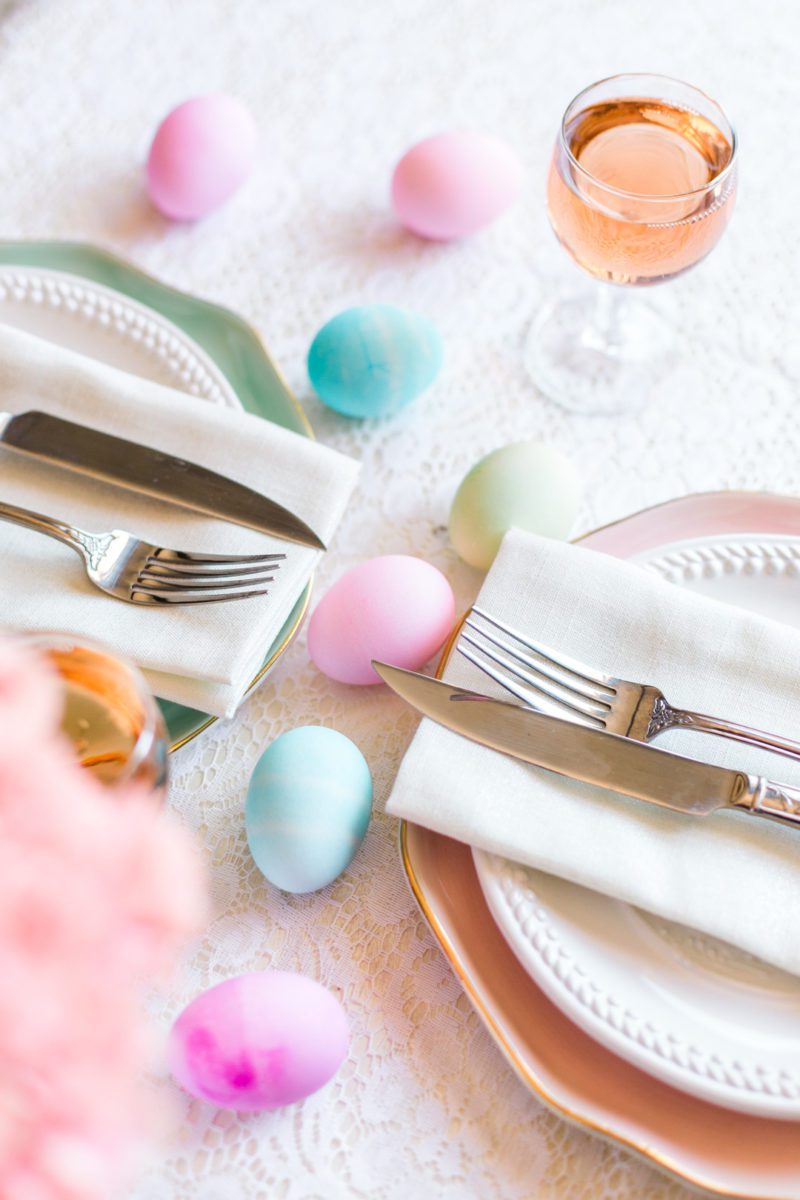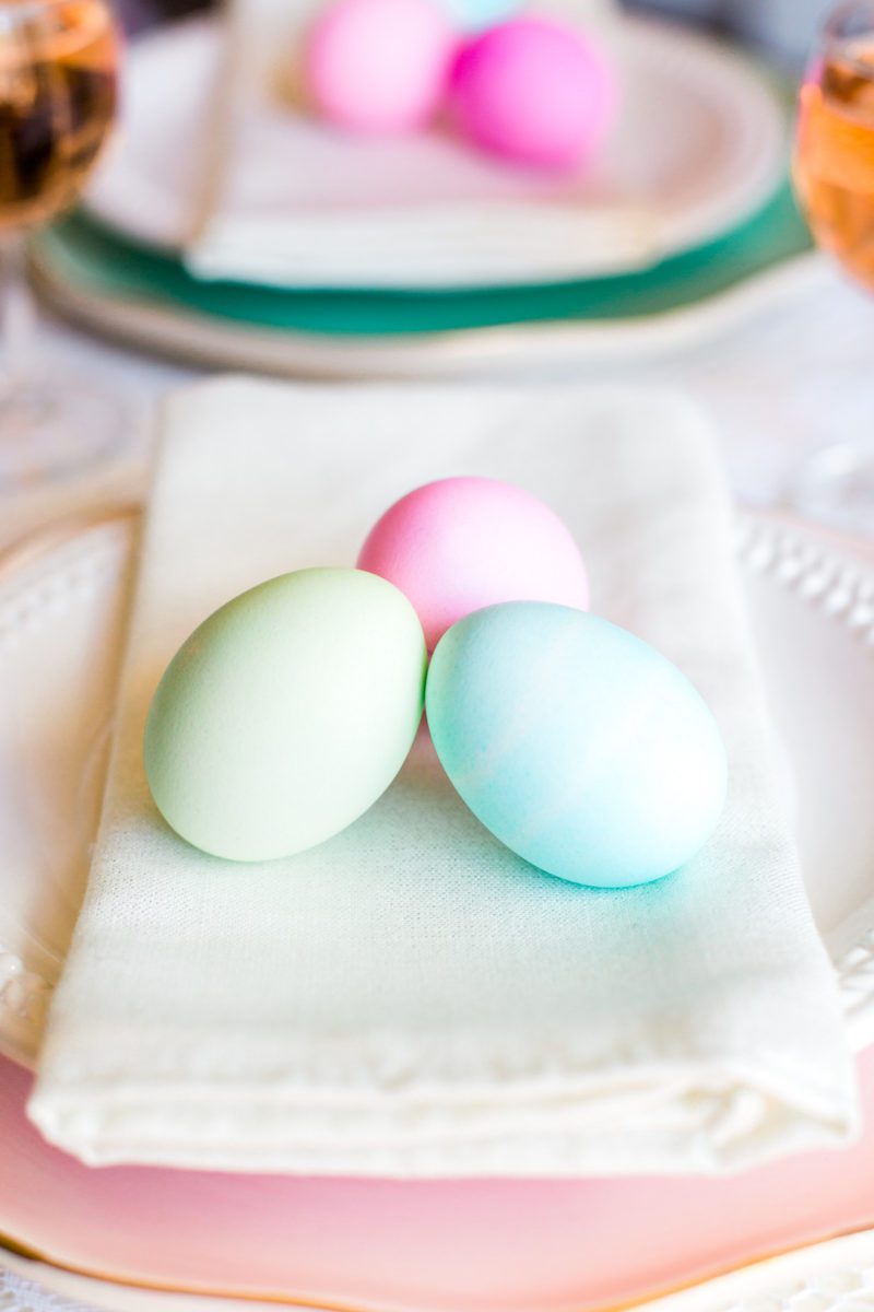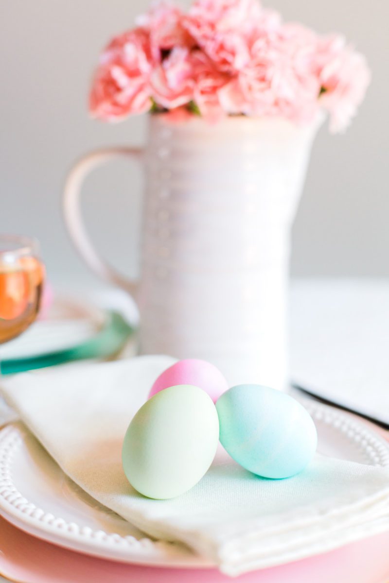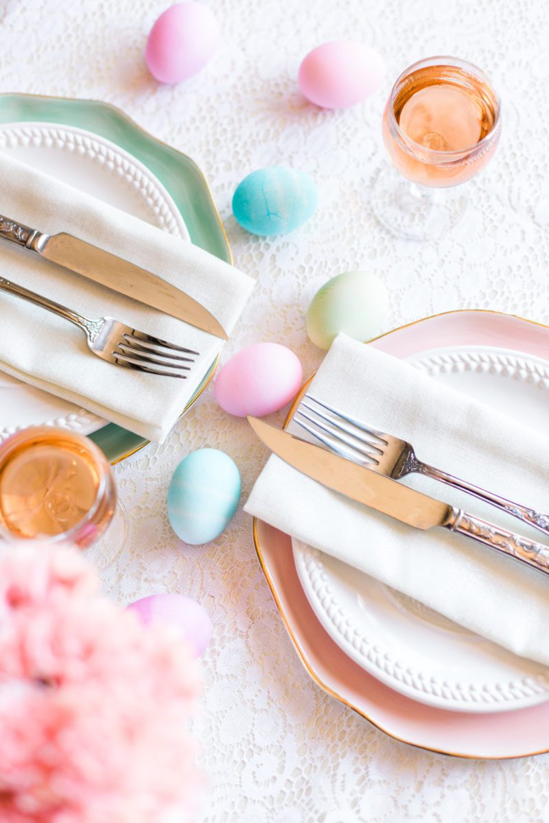 Less Is More: The combination of a beautiful pink charger, ceramic trimmed plate and pastel colored eggs is a the right amount of style for a simple Easter brunch.