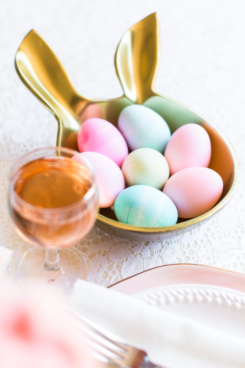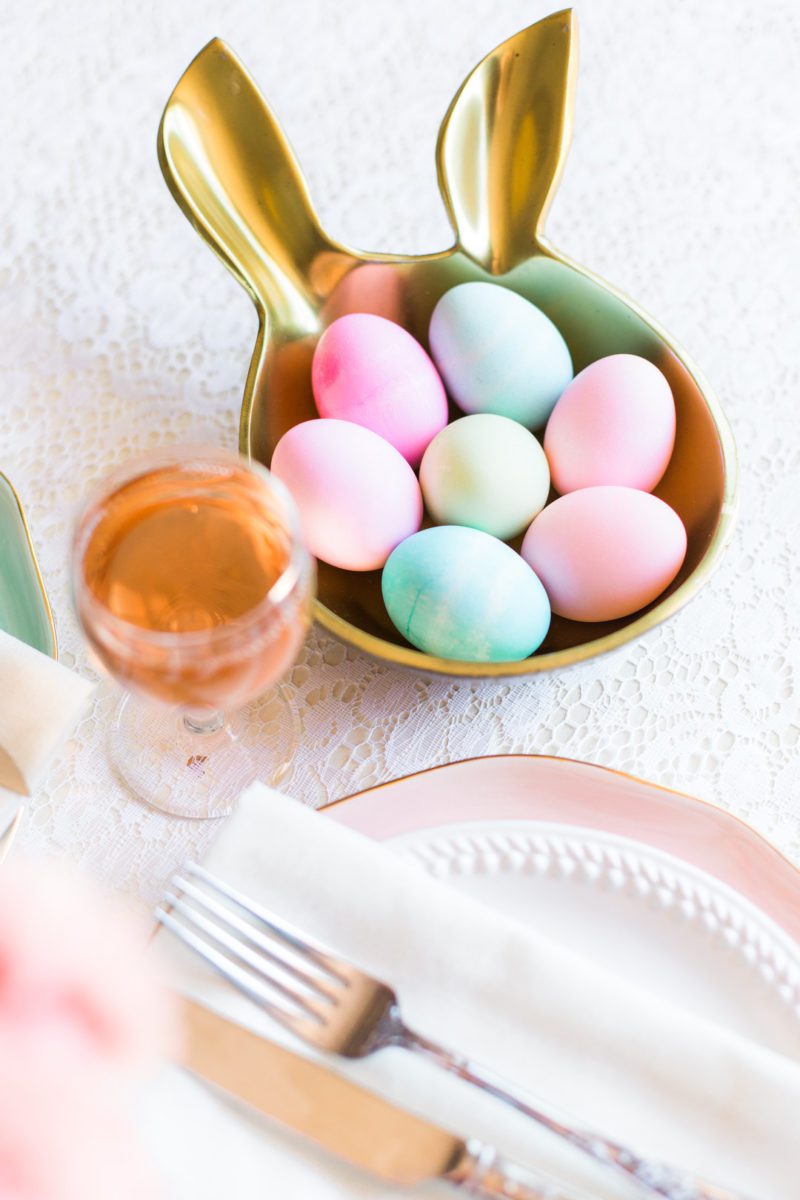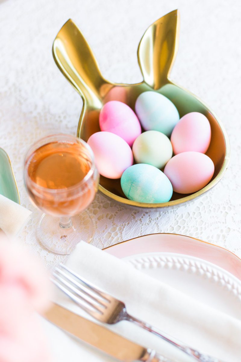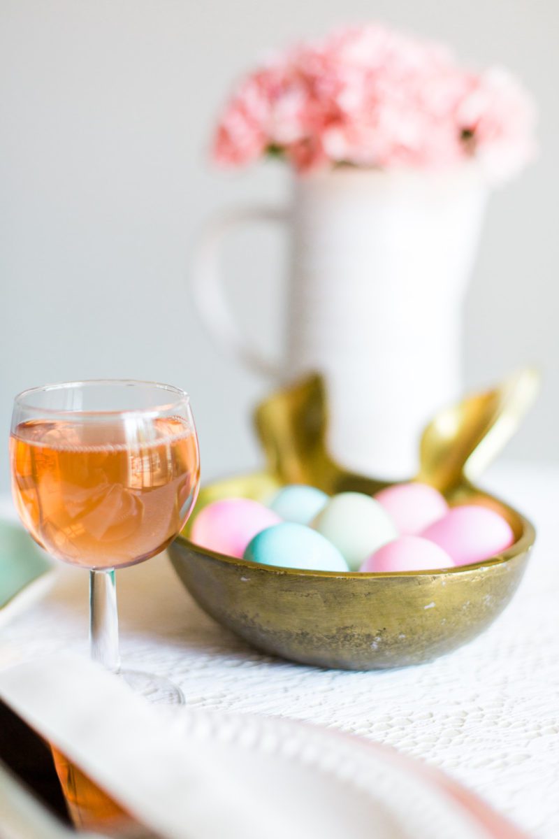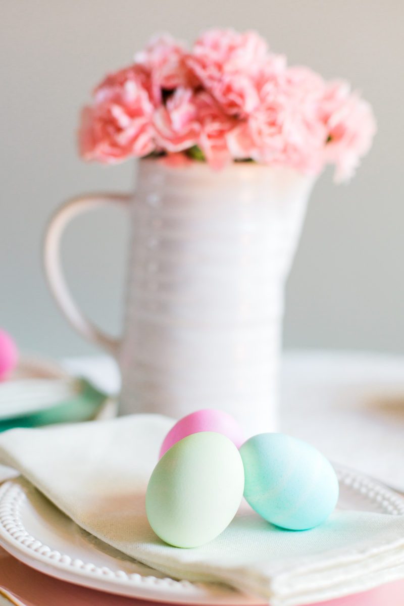 Less Is More: The combination of a beautiful pink charger, ceramic trimmed plate and pastel colored eggs is a the right amount of style for a simple Easter brunch.