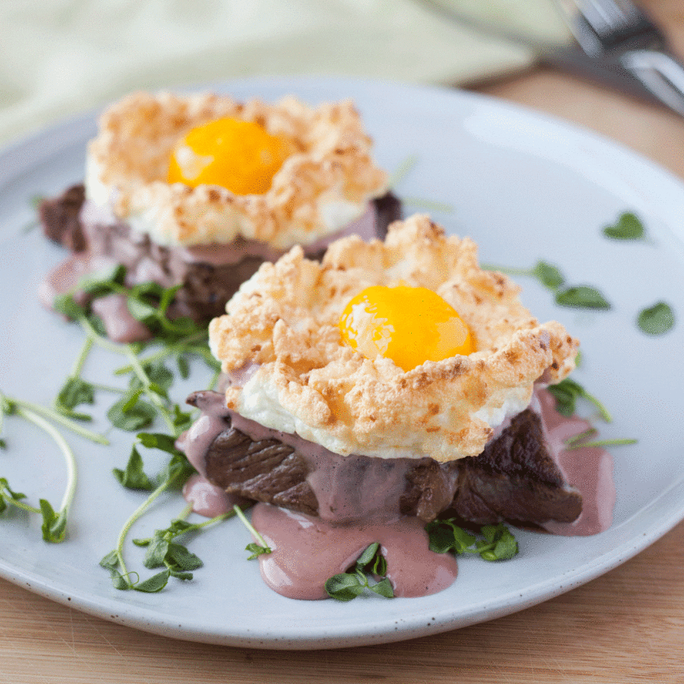Put each cloud egg on top of half the ribeye. Pour hollandaise sauce over the top and season with micro greens, chives and pepper.