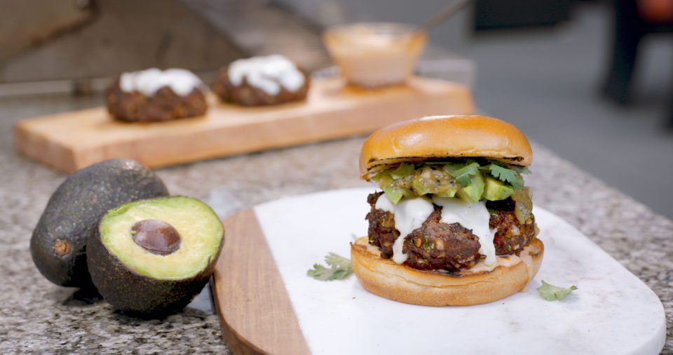 - Remove and serve on a toasted brioche bun with avocado, burger, tomatillo salsa, and aioli.