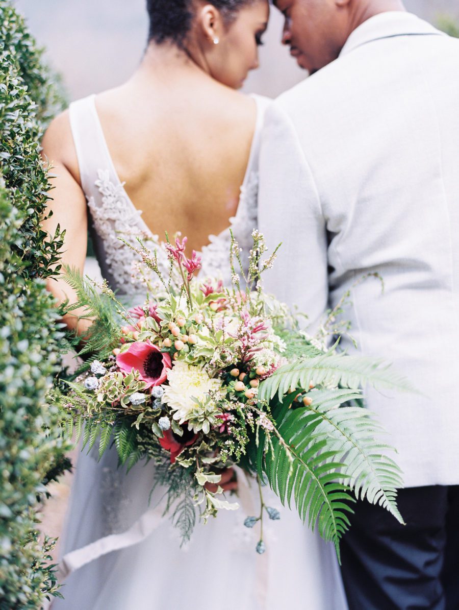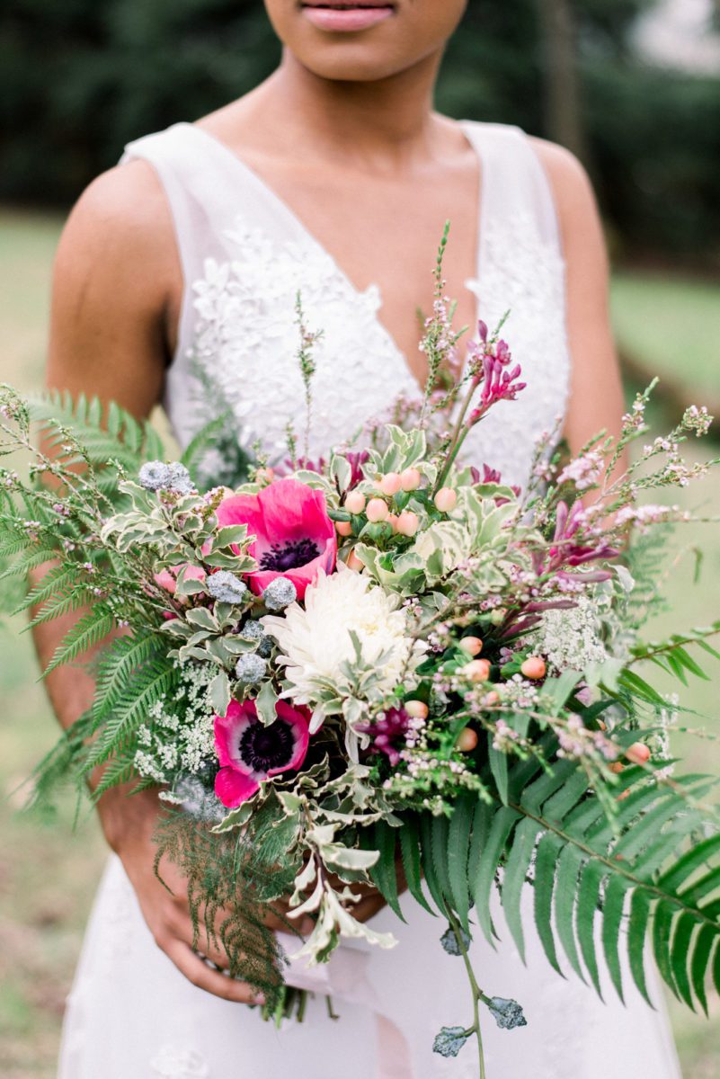 We adore this organic bouquet full of greenery and pops of color. It stuns in the backdrop of this traditionally designed room.
