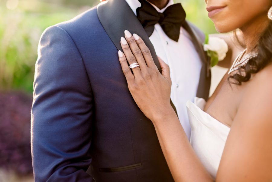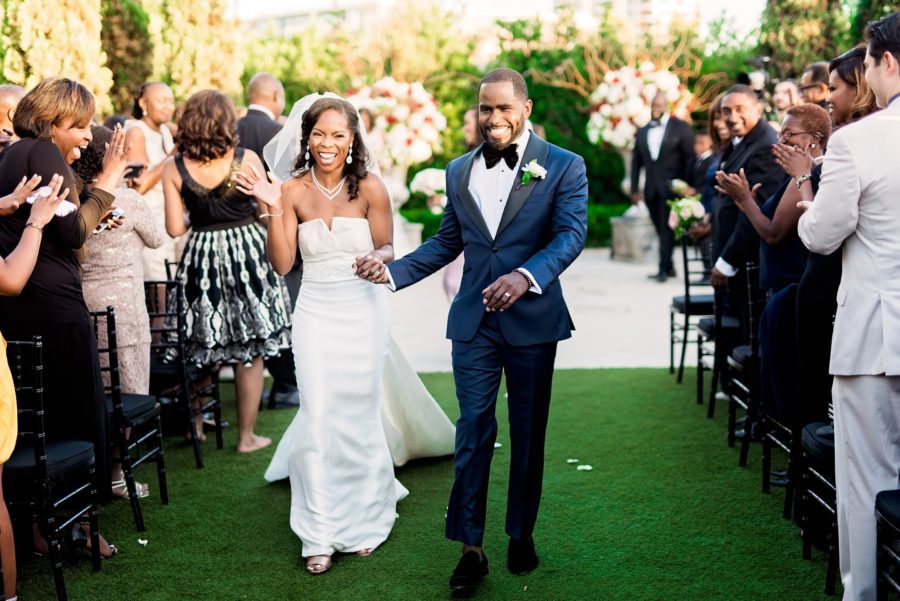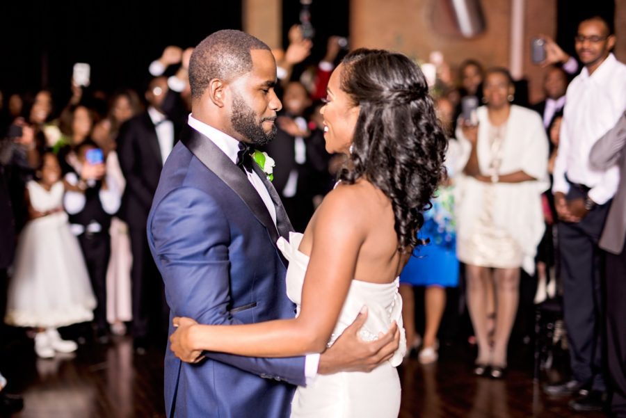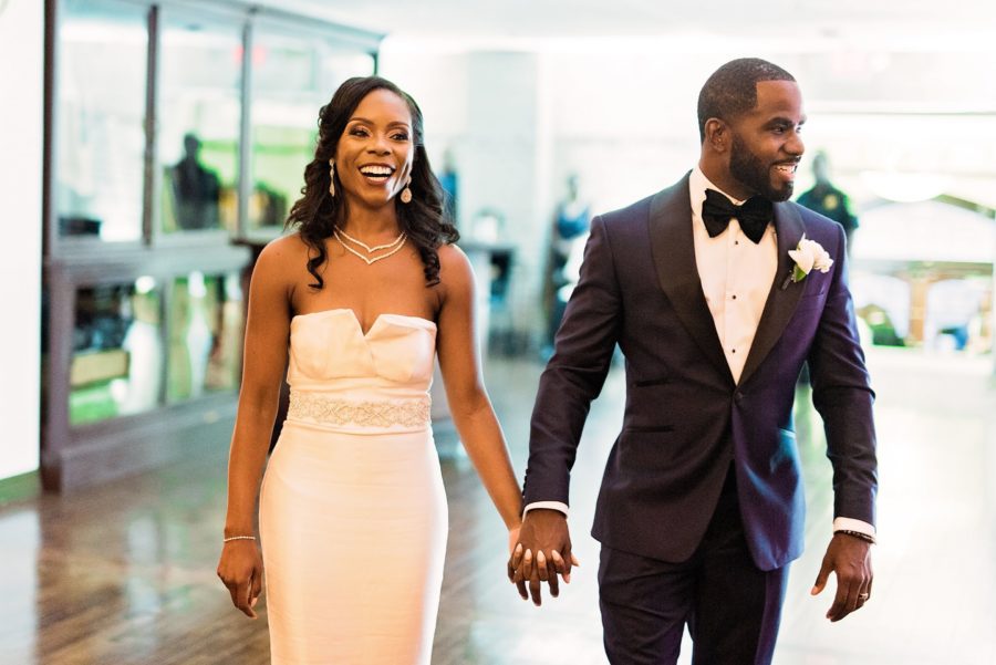Love story via Bride: We met at a networking event at the valet stand. I was with my line sister, and another friend and I noticed an attractive guy standing at valet, checking me out. He was lucky, because he was standing in front of the valet sign, so I had to go there any way. He engaged me in small talk, and then I turned my attention to my other friend who was there with me. Much to my surprise, my line sister was talking to him during that time. My car finally arrived and he walked me to the car and informed me that my line sister, gave him my number (which she has never ever done) and told him I was an amazing person and he should call me. When he texted me that night and then called the next evening (Saturday) to ask me out later that week, I knew I needed to take a closer look at him, and I did….1.5 years later, my family had flown in from Chicago to celebrate Christmas with us and to meet Andre’s family. We were all at the dinner table on Christmas night, after we finished eating and started to exchange gifts. His mother brought out a Johnny Walker box and handed it to me. Andre is the whiskey lover and I felt the gift may be better for him, but I smiled and accepted it. Inside the box was a bottle of Veuve Clicquot which my friend gave me to save for a special occasion. We saved this bottle since the beginning of our relationship, because we never felt it was the right time to drink it. The note inside said “this is that special occasion…will you marry me?” It was very special because the proposal was in front of our entire family and no one other than my father knew he was going to propose. Wedding Style via Bride: I had a wedding dress and a reception dress. My wedding dress was a more classic strapless, mermaid shaped, 100% silk, Manuel Mota for Provonias dress with a long train in the back. I tried on many different wedding dresses and styles and kept going back to my original dress. I even freaked out 1 month before the wedding wondering if I picked the right dress and went back and tried on more dresses…I was reassured that I had made the right choice. I knew I wanted my reception dress to be more fun and dramatic. It took me longer to find my reception dress than my wedding dress. I looked for over 8 months for a reception dress EVERYWHERE. The Wednesday before my wedding, my friend called and sent me the info of a prom store that she called already and told them I would be coming. I found at least 5 potential dresses that day, but feel in love with a detailed lace leather dress with a dramatic tulle train Culture of Wedding via Bride: We both pledged. Gina-Delta Sigma Theta and Andre-Alpha Phi Alpha. Therefore, at the reception the deltas sang the sweetheart song followed by alphas singing to me, the bride. Memories via Couple: The best memory from our wedding was the reception. We partied as soon as we walked in. Everyone was on the dance floor and lifted us up in the air and threw money on us. We didn’t start eating until 2 hours later Advice from Couple: Do what makes you happy at your wedding. Spend money on parts of the wedding that’s important to you and save on the other areas. In Andre’s words: give her whatever she wants! Quick Facts: Bridesmaids/Groomsmen gifts: Bridesmaids: their bridesmaid dress, slip on shoes for reception, robe and earrings. Groomsmen: whiskey decanter set, scotch and lapel pin First dance song: Faithfully by Journey Favorite item on the menu via Couple: Katafi wrapped shrimp by Chef Javani King