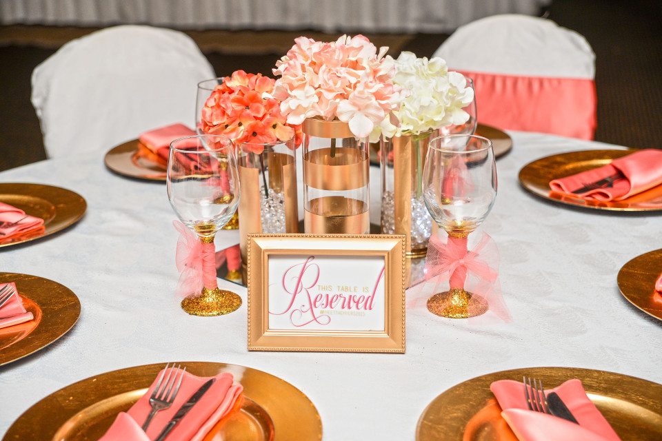 Hand glittered wine glasses as a gift for bridesmaids and letters used to spell out last name on sign in table