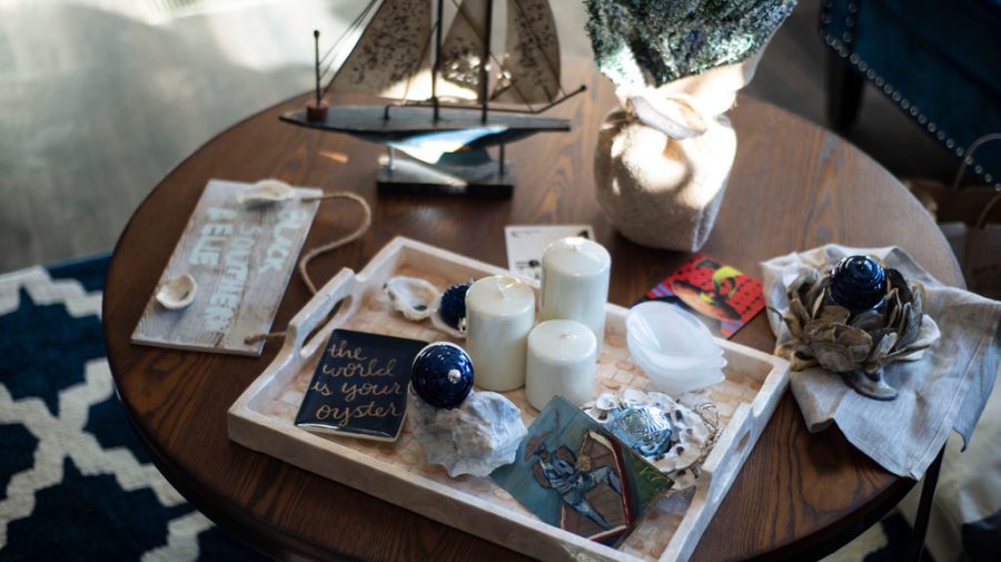 A coffee table is a great place to add some holiday cheer with minimal effort. A great base for a Lowcountry Christmas is a white serving tray to put a few of your favorite holiday and coastal elements. For this table, I added seashells from a local thrift store paired with my favorite note cards, holiday ornaments and more.