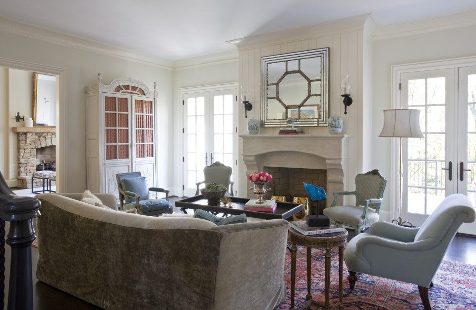 This ceiling and mirror combination is a little piece of heaven. A ceiling can never be too high and the details on this one are to die for.If you are looking to add a pop of color to your neutral style without going wild this picture is the perfect inspiration. A few pieces of bright oranges as a centerpiece and a teal pillow add just the right pop of color for this room and can help your home as well.This room is perfect for entertaining. For a cold day warm up the fireplace and on a spring afternoon, those french doors are all the excuses you need to host a party.