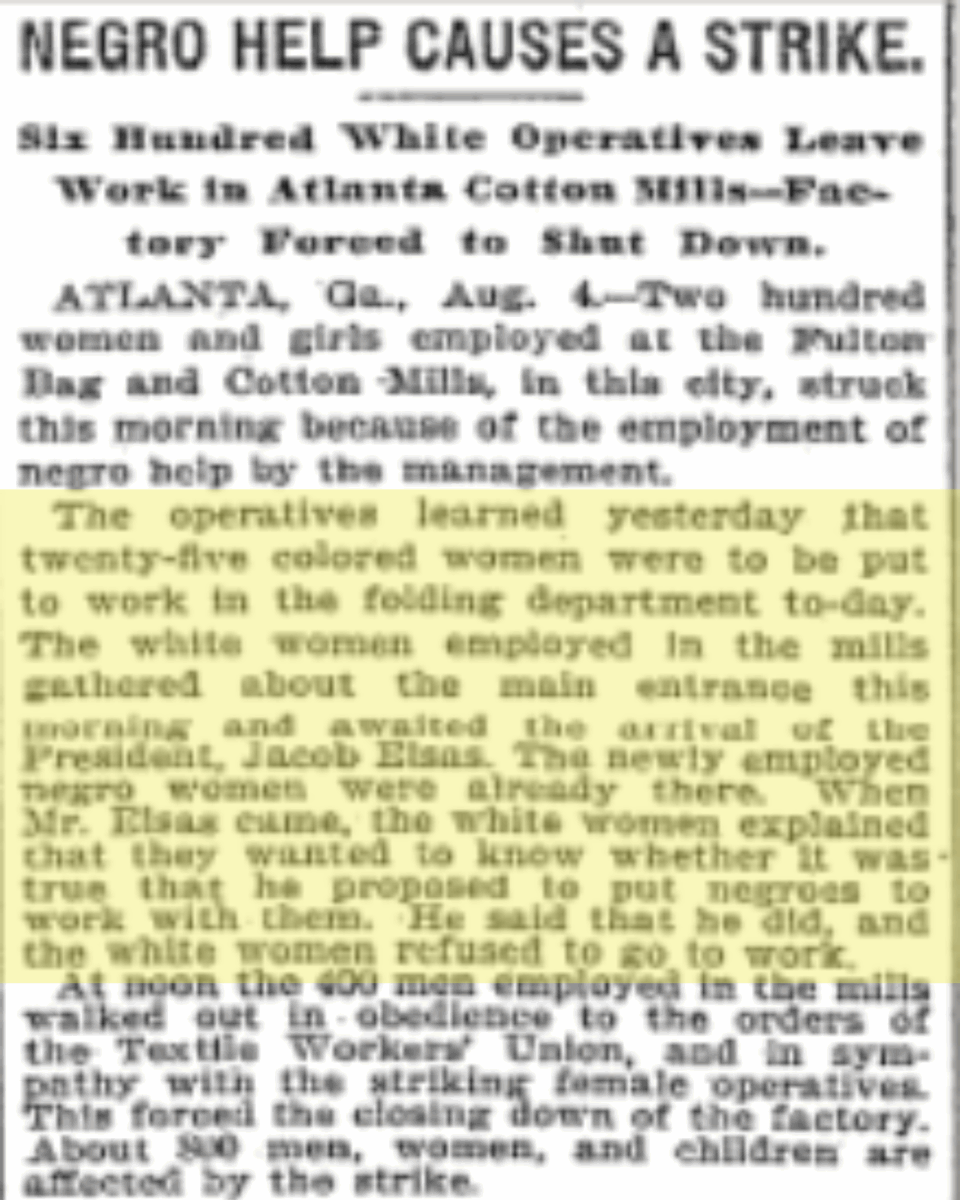 According to the Lowcountry Digital History Initiative (LDHI), the owners of Atlanta Mills in Georgia attempted to do the same thing in 1897. “At almost the same time, in August 1897, Atlanta Mills in Atlanta, Georgia hired a few black workers to fill out its workforce. Fifteen hundred white workers went on strike to protest the presence of just eight black women—and unlike the Charleston protesters, they succeeded in having all the black women dismissed.” On August 5, 1897, the New York Times reported the incident.