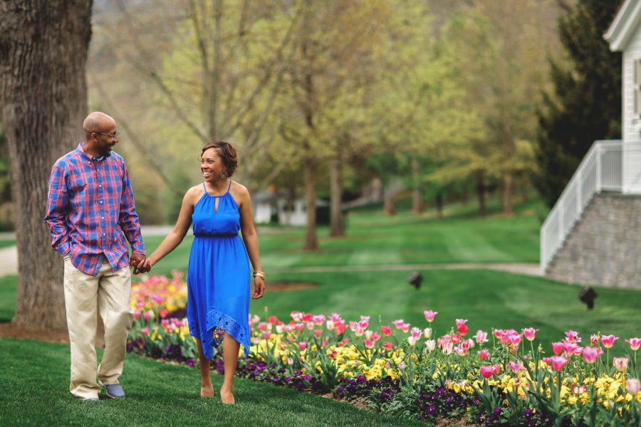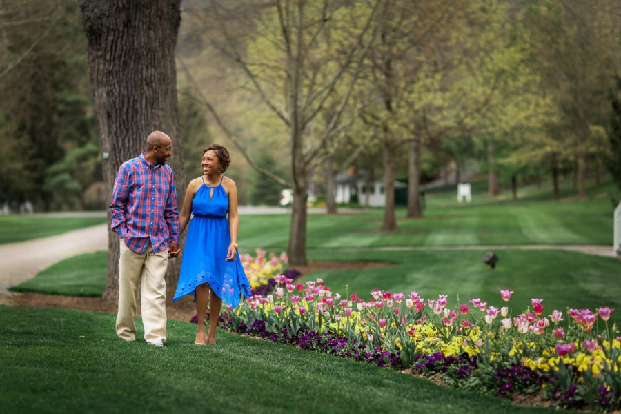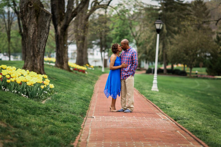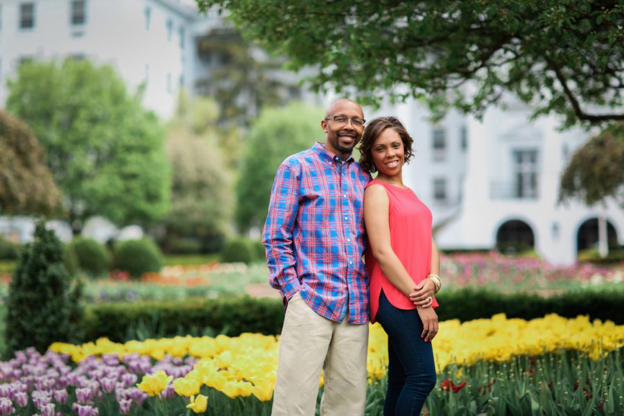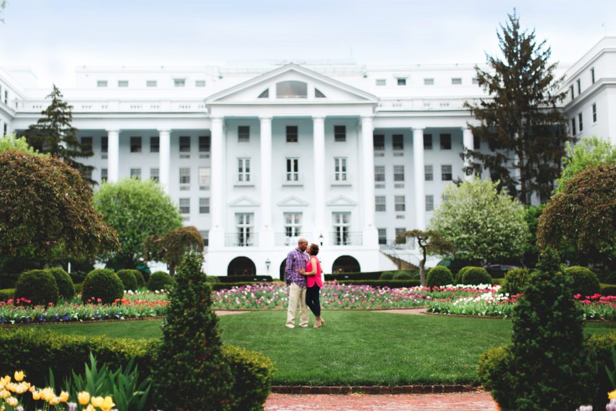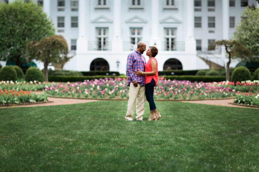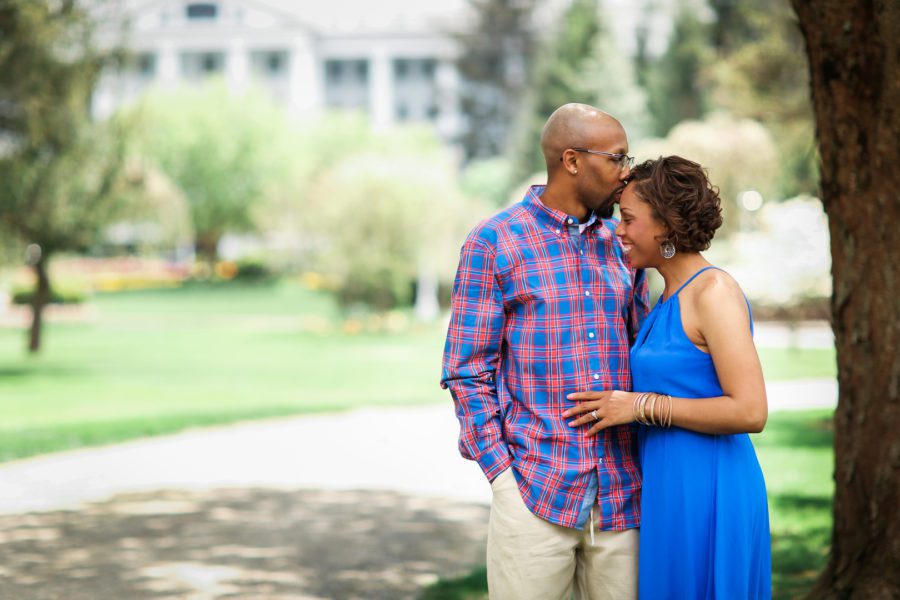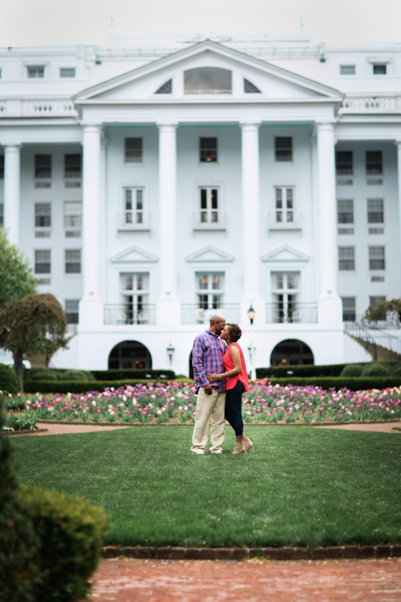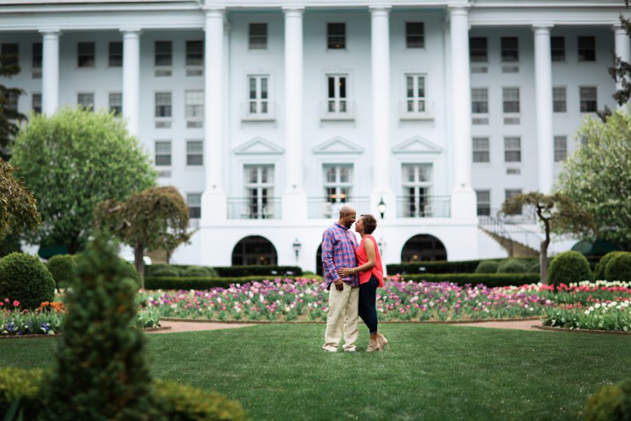 With lots of scheduling conflicts throughout the course of our correspondence we ended up shooting midday with Keisha and Larry at The Greenbrier Resort in White Sulpher Springs, West Virginia. If super sunny, the plan was to shoot our entire engagement session indoors, and while The Greenbrier is breathtaking (inside and out), it was really my hope for an overcast day so we could take advantage of the beautifully landscaped grounds at America’s Resort. It seems Mother Nature was partially on board and decided to give us a cloudy day, and while we spent a lot of our time waiting for the sun to go back behind a cloud, it also gave me a chance to get to know Larry and Keisha more! It’s such a small world, because Keisha and I know a lot of the same people, even though we had never met!